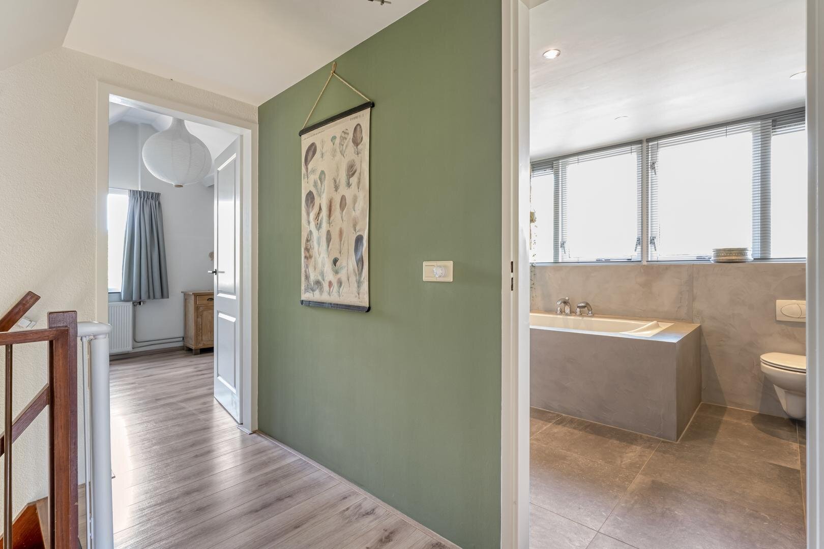 Eerste verdieping: overloop met vaste kastenwand. 2 Ruime slaapkamers, beide voorzien van een laminaatvloer en extra bergruimte. Badkamer voorzien van vloerverwarming, met dubbele wastafel en meubel, ligbad, douche en toilet.