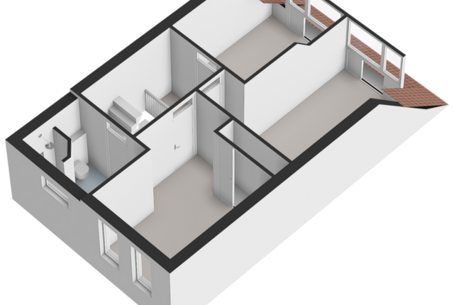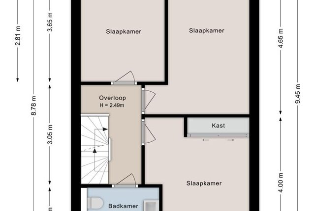 Eerste verdieping: Overloop. Drie slaapkamers voorzien van vaste kasten. Badkamer voorzien van inloopdouche, toilet en wastafelmeubel. Met vaste trap naar..