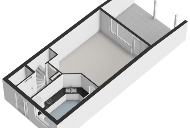 Begane grond: Entree met toilet en trap naar de eerste verdieping. Woonkamer met grote raampartij en laminaatvloer.
