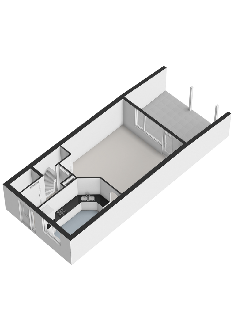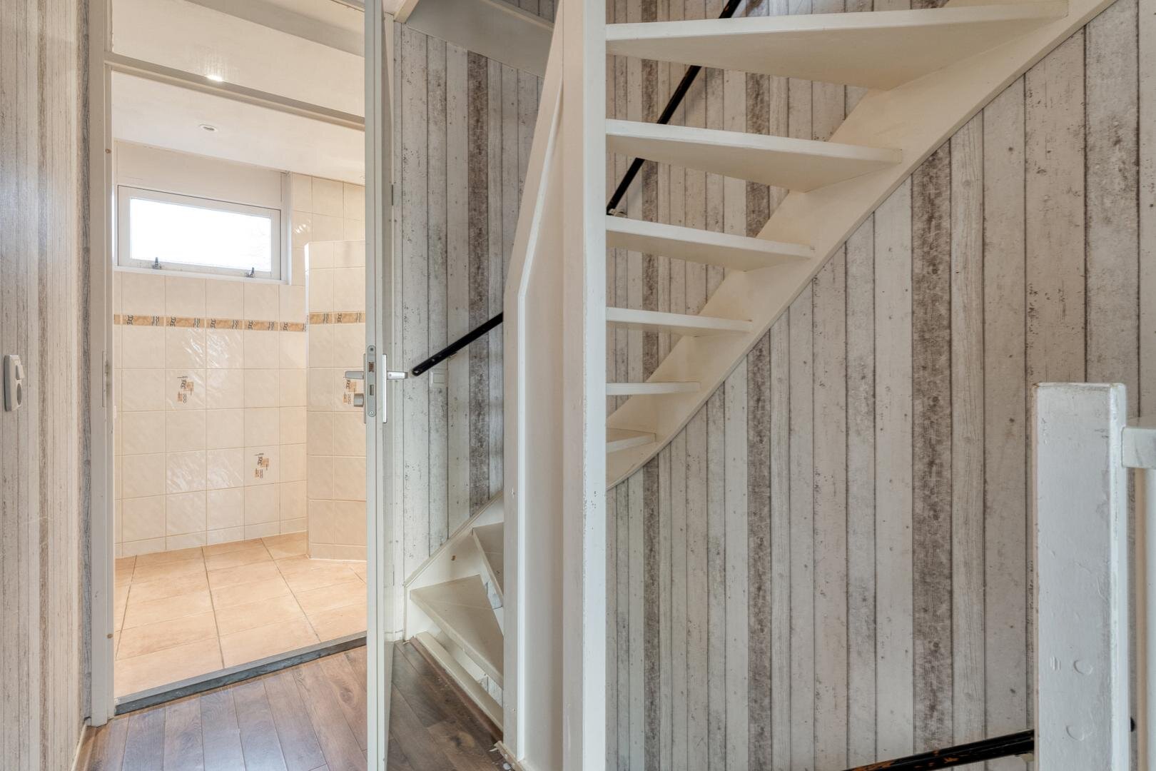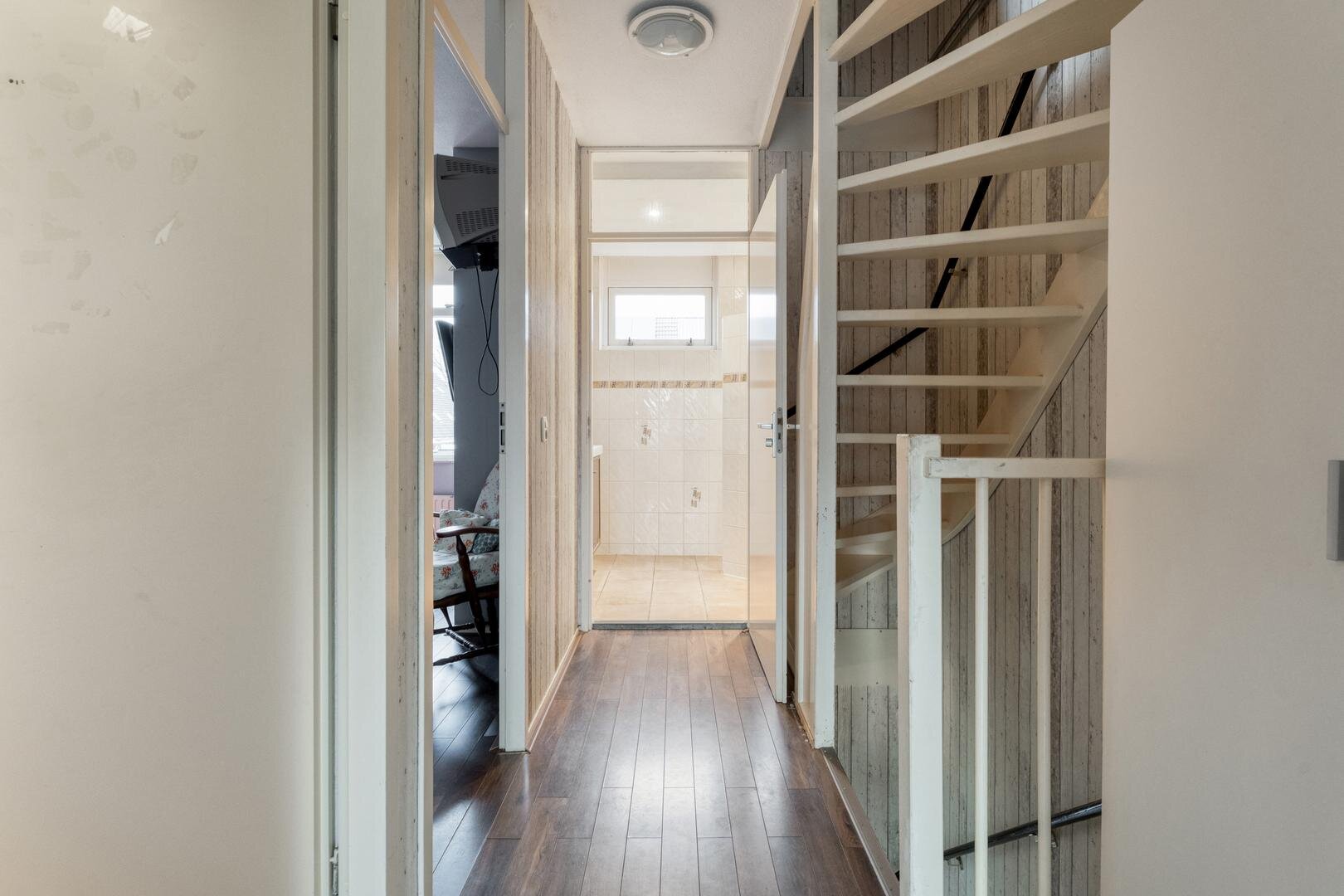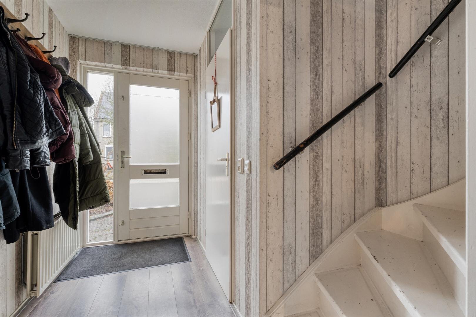 Begane grond: Entree met toilet en trap naar de eerste verdieping. Woonkamer met grote raampartij en laminaatvloer.