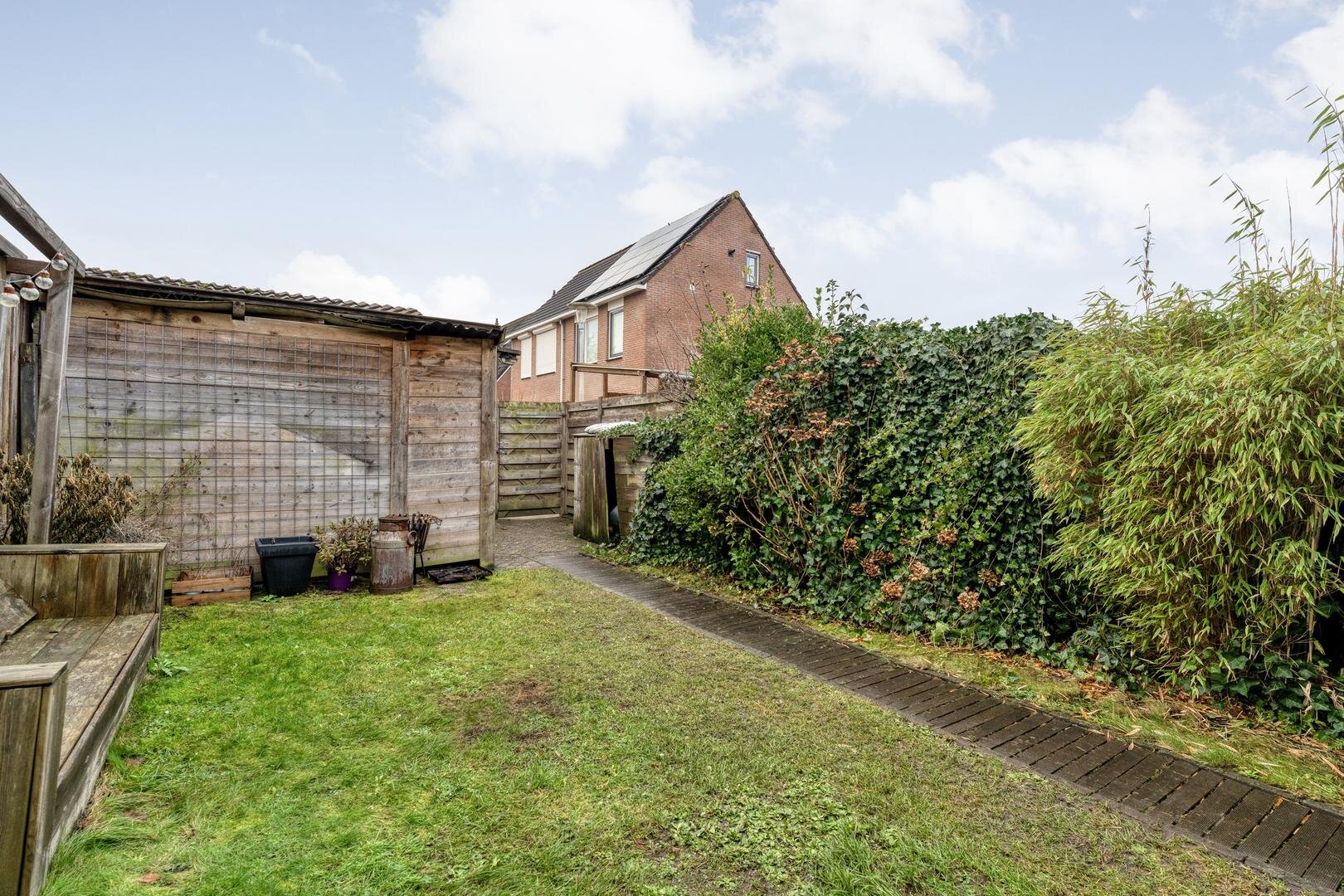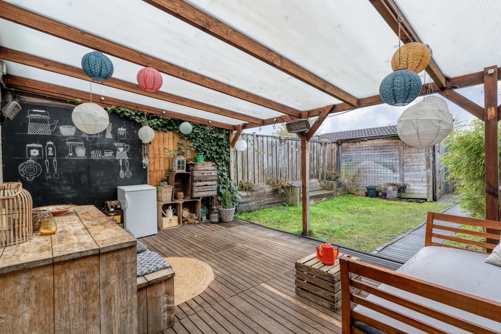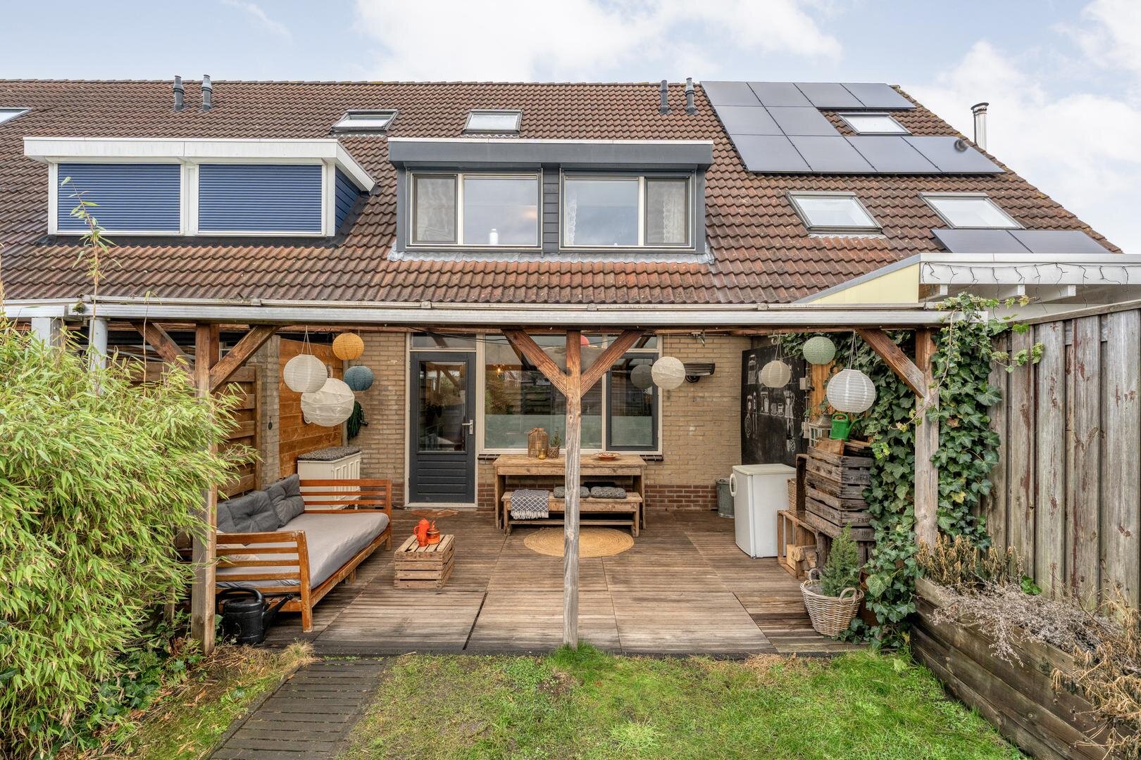 De zonnige achtertuin met overkapping ligt op het zuiden en biedt volop ruimte om te genieten van lange dagen buiten. Achter in de tuin staat een stenen berging en dankzij de achterom is de tuin ook praktisch in gebruik. Aan de achterzijde is de woning vrij gelegen door de aanwezigheid van parkeerplaatsen en een speeltuin. Met een perceel van circa 154 m2, een prettige indeling en een rustige ligging is dit een woning waar je je direct thuis voelt.
