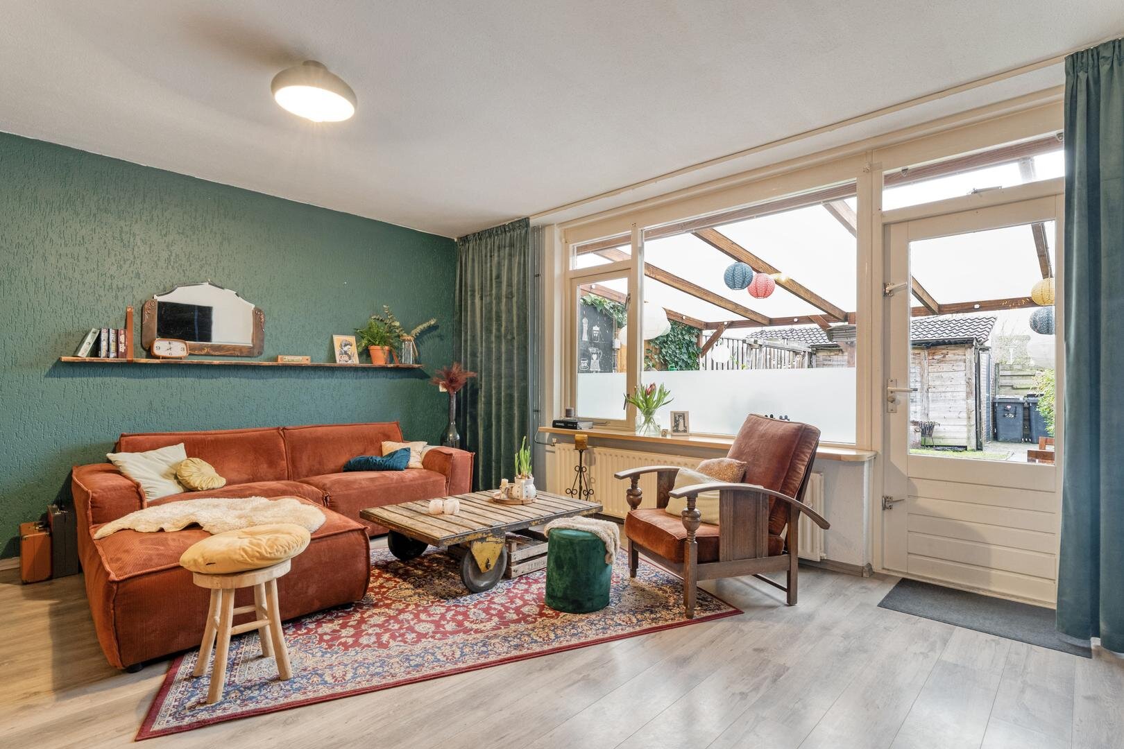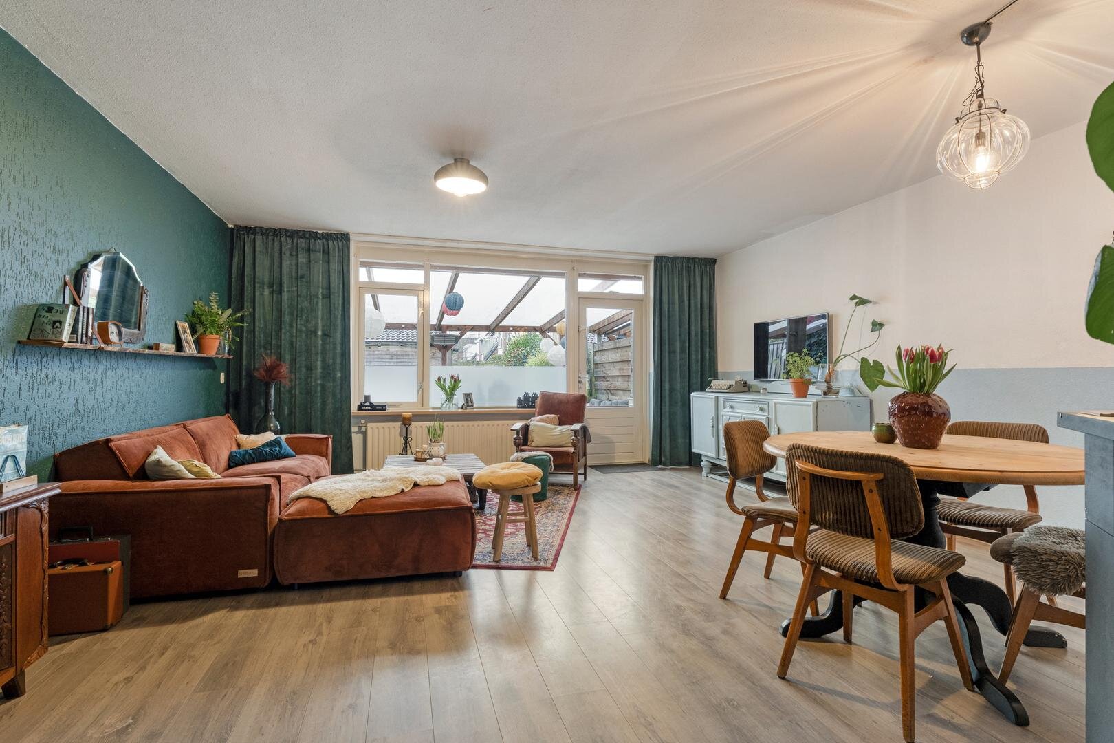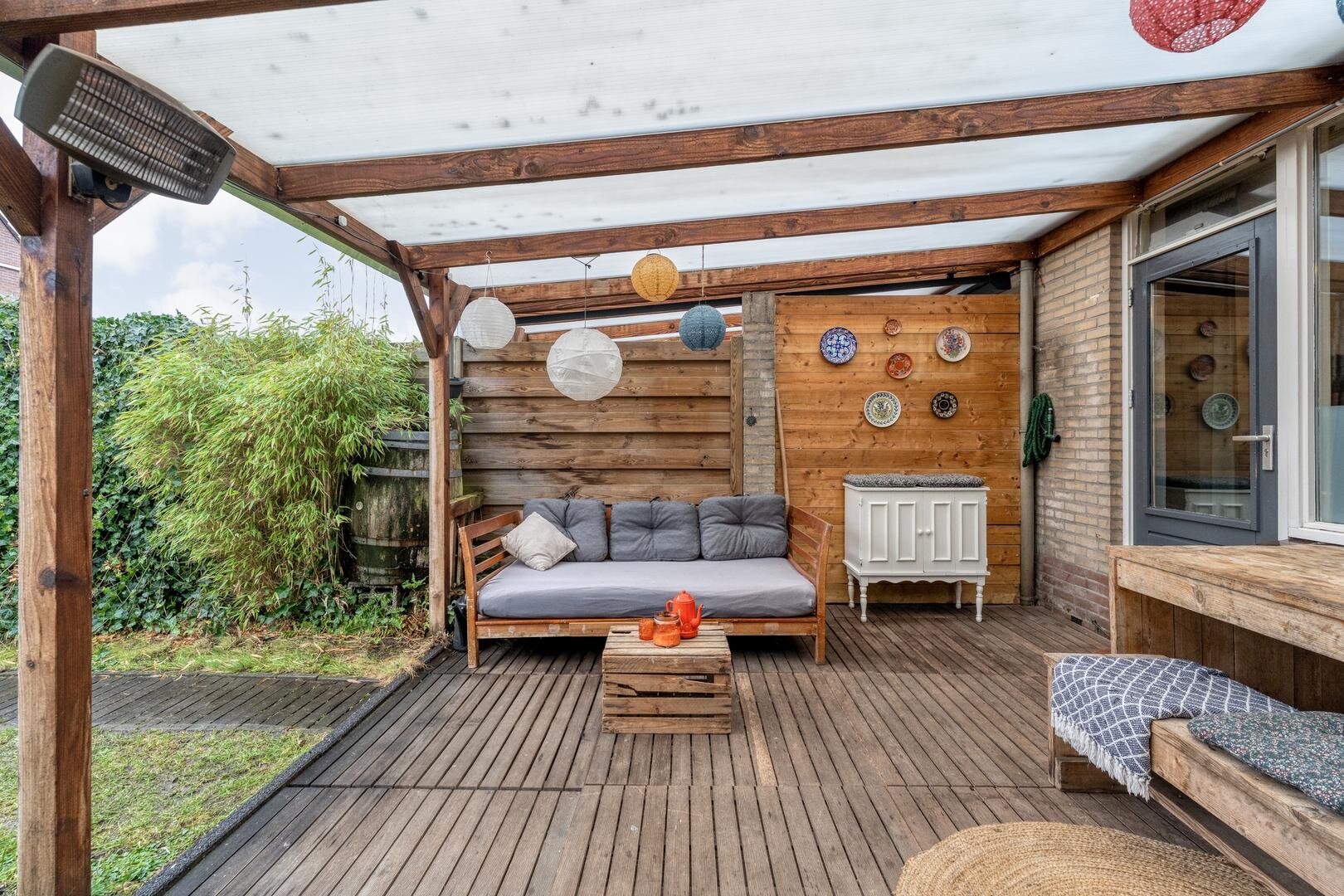 De zonnige achtertuin met overkapping ligt op het zuiden en biedt volop ruimte om te genieten van lange dagen buiten. Achter in de tuin staat een stenen berging en dankzij de achterom is de tuin ook praktisch in gebruik. Aan de achterzijde is de woning vrij gelegen door de aanwezigheid van parkeerplaatsen en een speeltuin. Met een perceel van circa 154 m2, een prettige indeling en een rustige ligging is dit een woning waar je je direct thuis voelt.