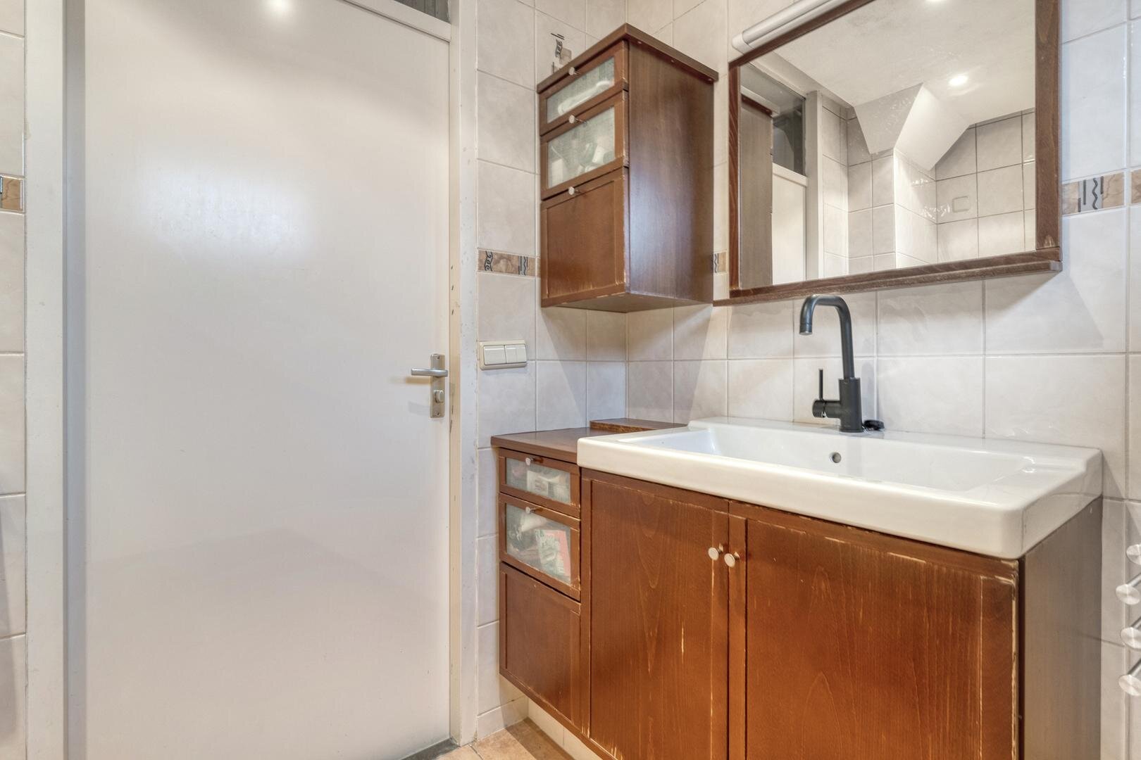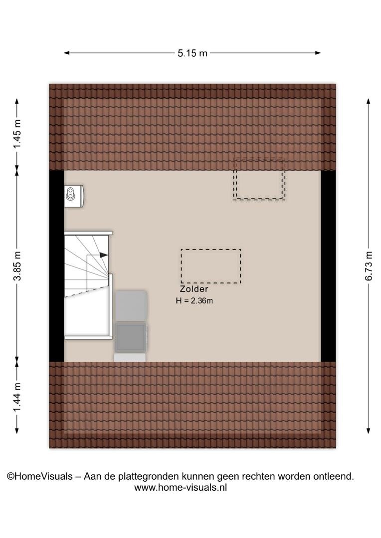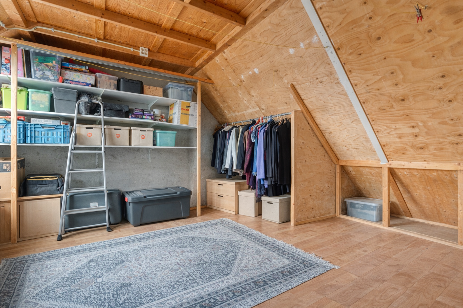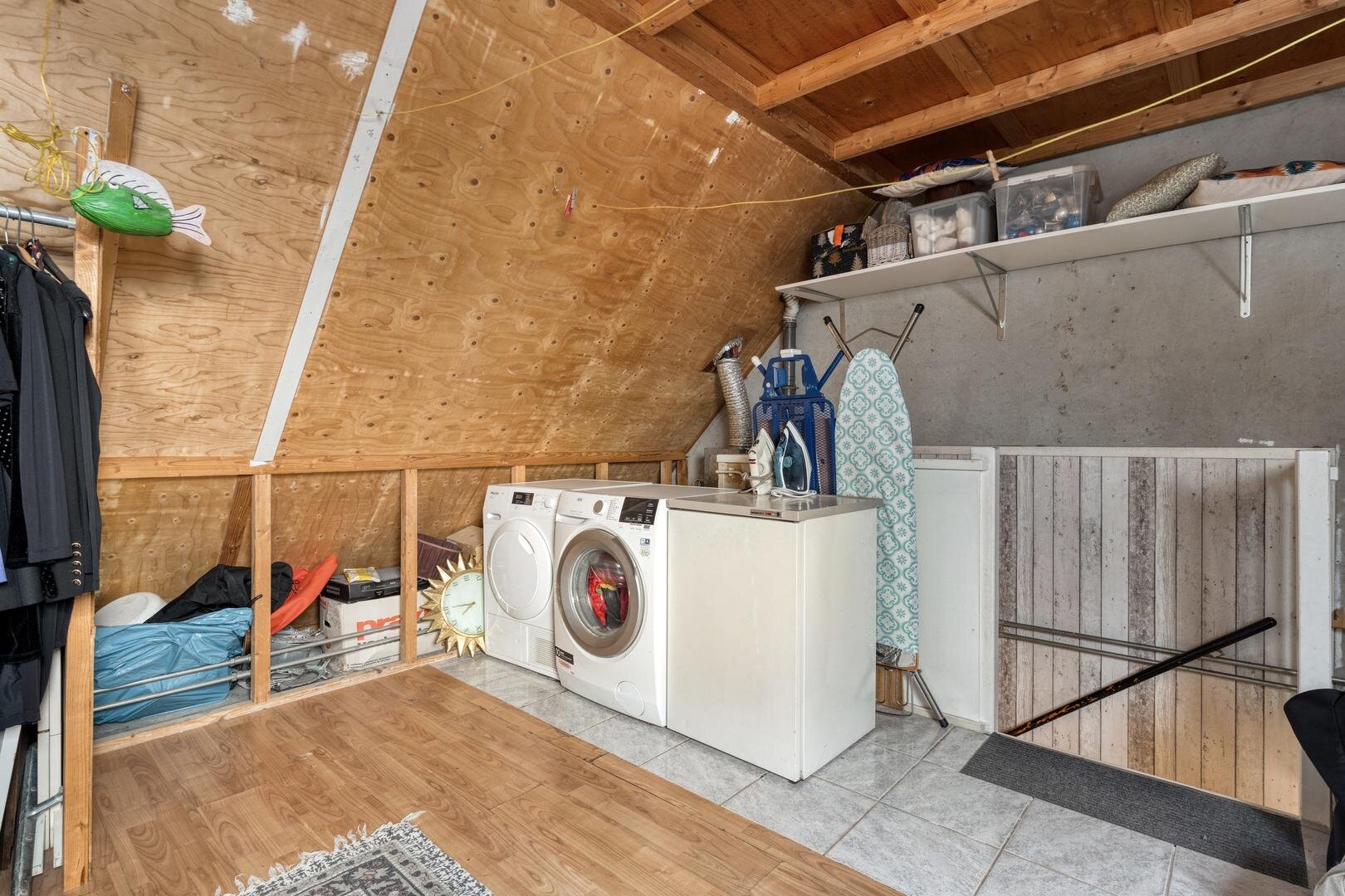 Zolder met wasmachineaansluiting en vliering.