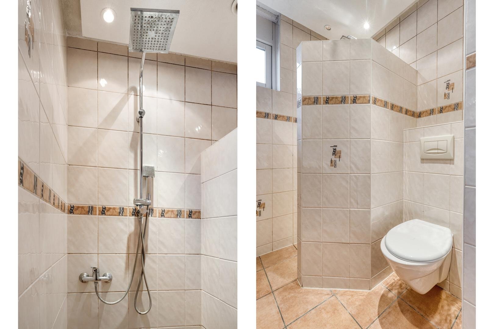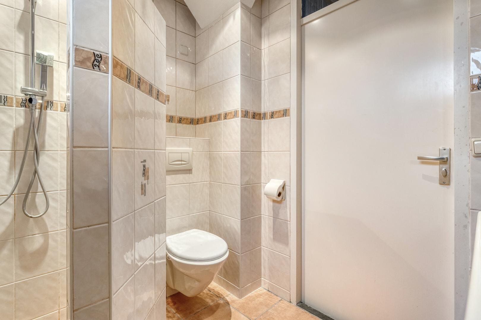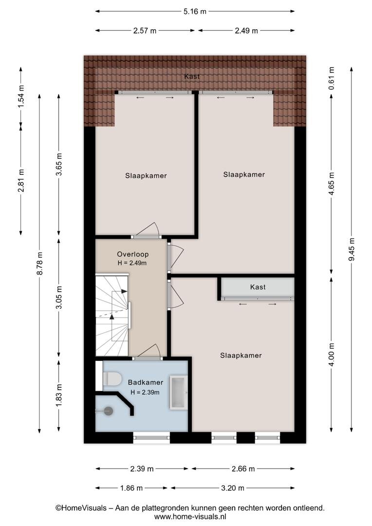Eerste verdieping: Overloop. Drie slaapkamers voorzien van vaste kasten. Badkamer voorzien van inloopdouche, toilet en wastafelmeubel. Met vaste trap naar..