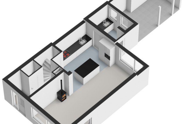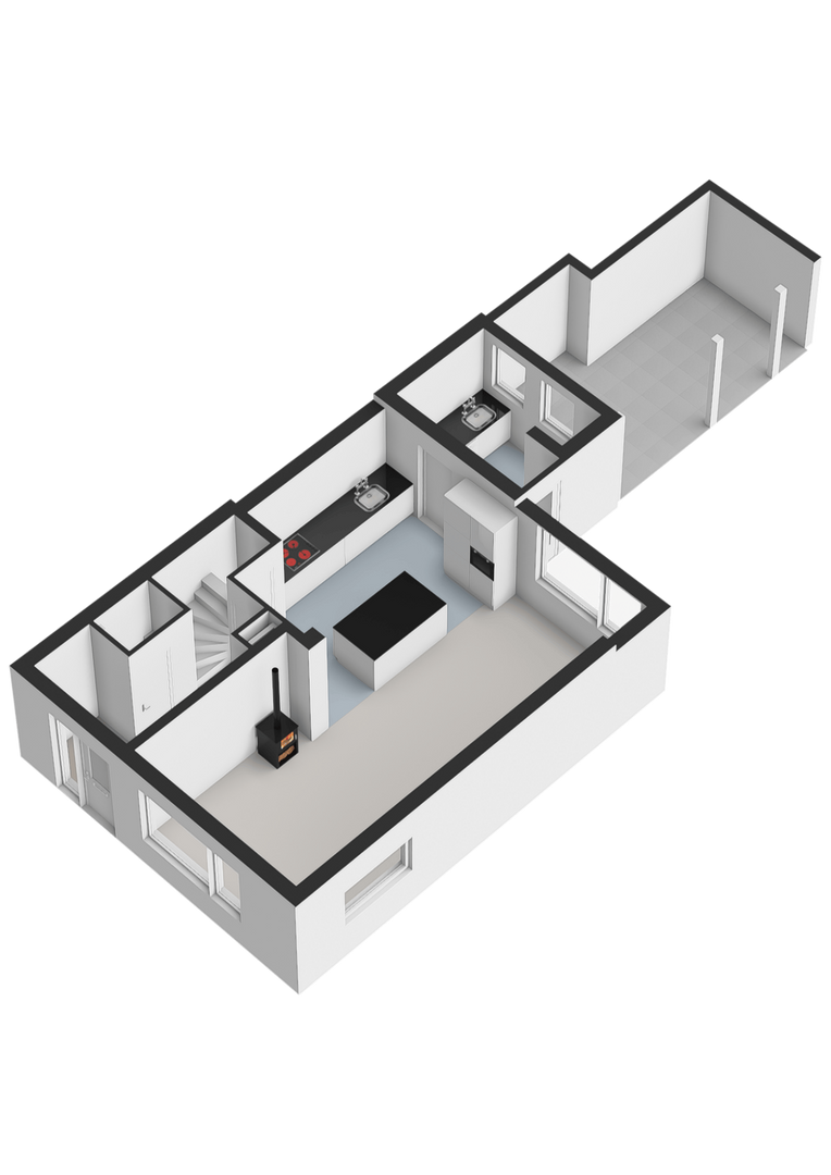 Begane grond: Entree met toilet en trap naar de eerste verdieping. Open keuken (2018) met eiland. De keuken is voorzien van inductiekookplaat, afzuigkap, combi-oven en vaatwasser. Doorzonwoonkamer met pvc vloer en houtkachel.