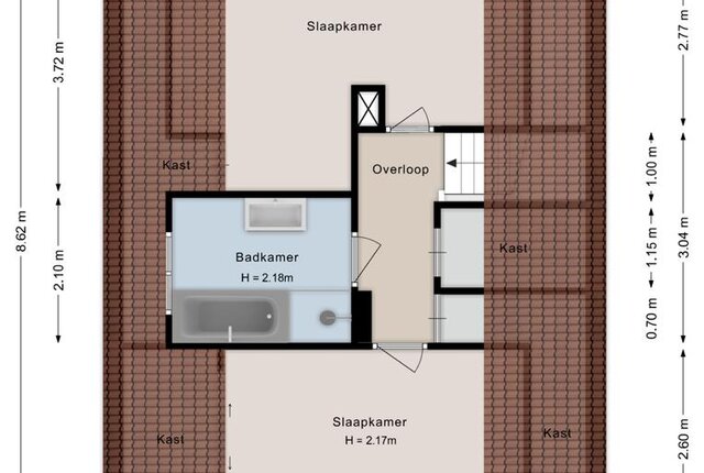 Eerste verdieping: overloop. 2 slaapkamers. Badkamer voorzien van douche, ligbad, toilet en wastafel.