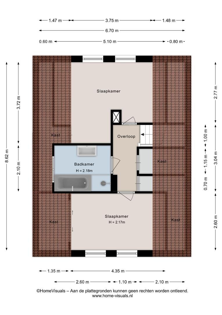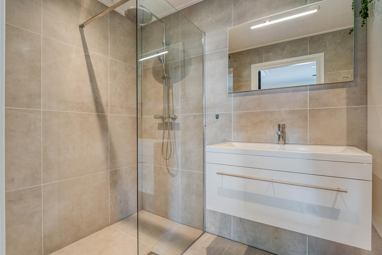 Eerste verdieping: overloop. 2 slaapkamers. Badkamer voorzien van douche, ligbad, toilet en wastafel.
