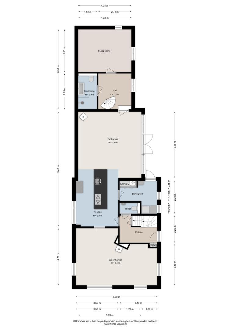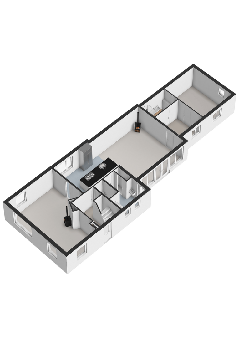 Begane grond: Hal/entree met toilet en vaste trap naar 1e verdieping. Woonkamer met veel lichtinval voorzien van een eikenvloer en een sierhaard. Woonkeuken met gaskookplaat, afzuigkap, vaatwasser, oven en koelkast. Bijkeuken voorzien van wasmachineaansluiting. Tussenhal voorzien van wenteltrap naar 3e slaapkamer. Badkamer voorzien van vloerverwarming, inloopdouche, toilet en wastafelmeubel. Slaapkamer.
