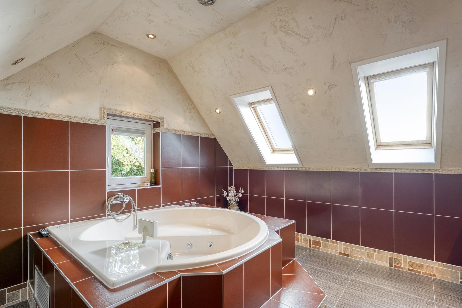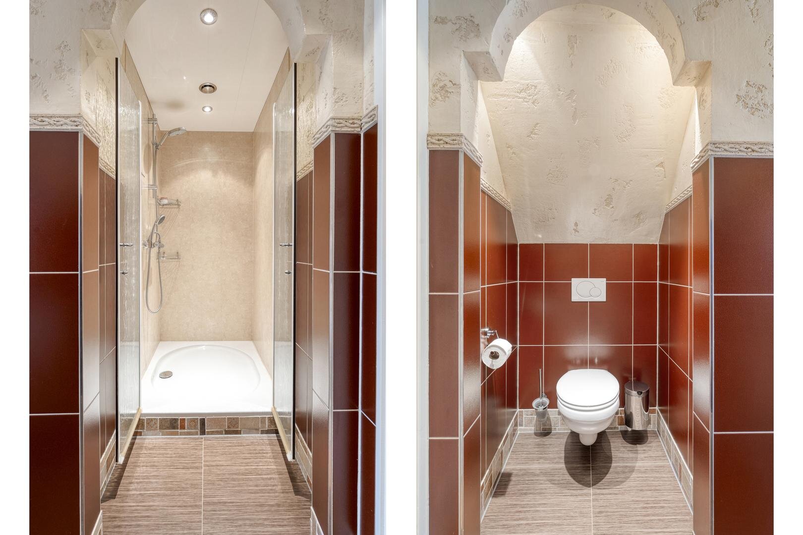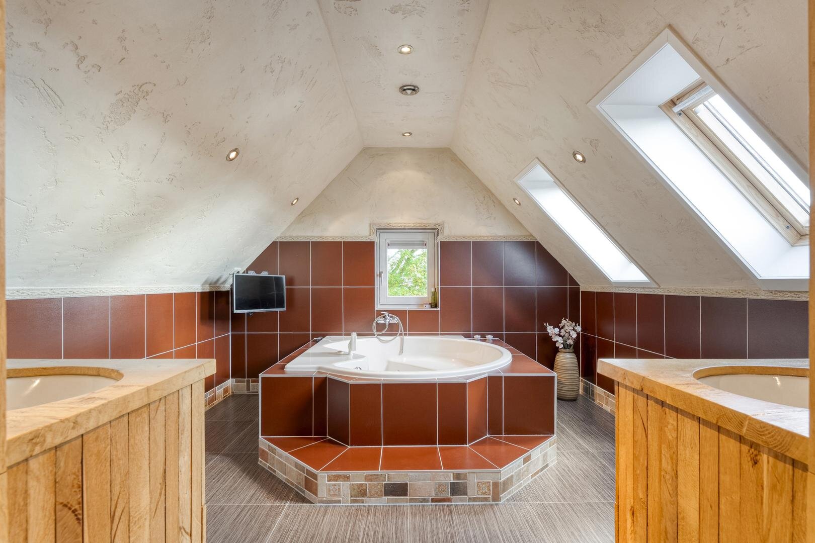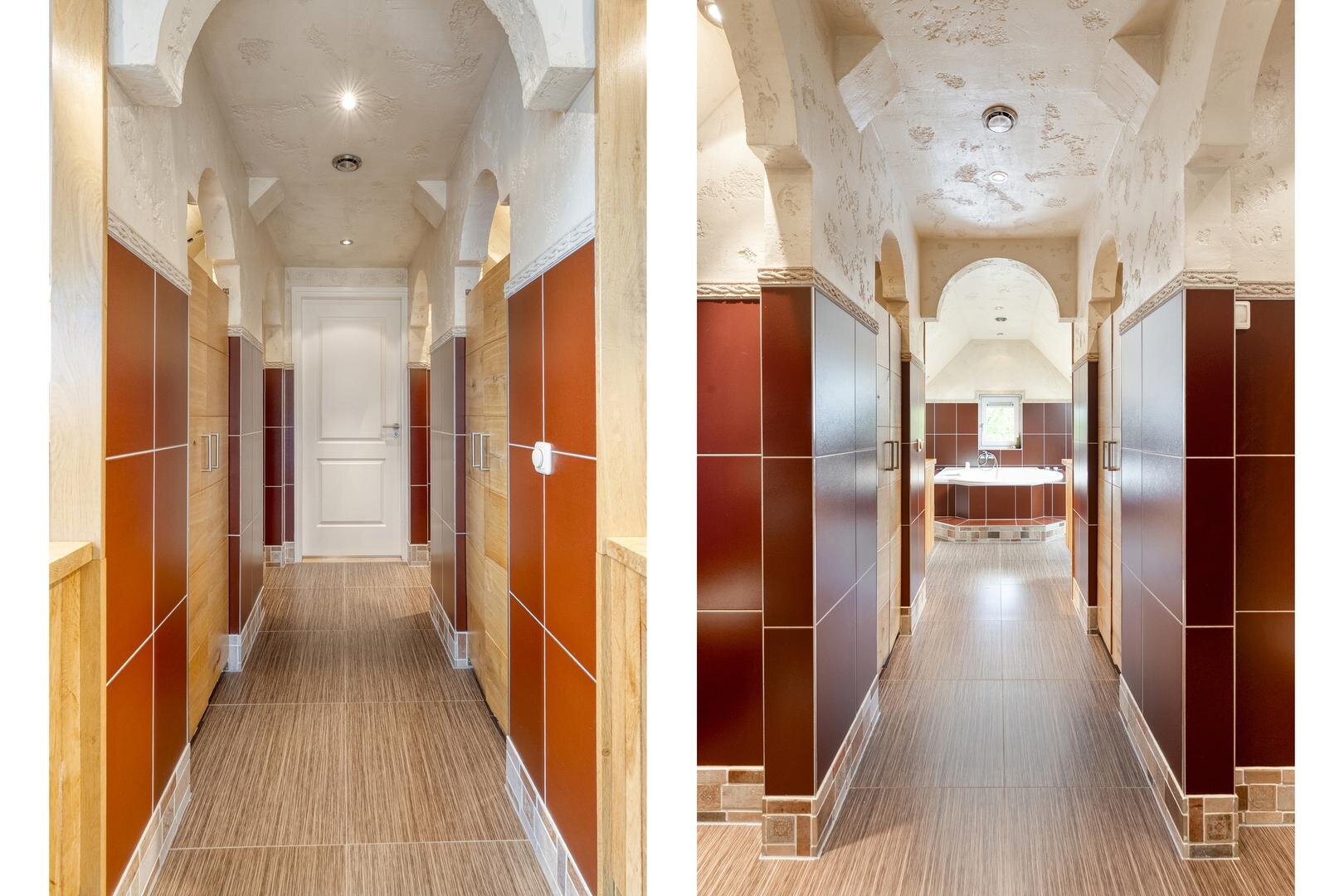 Eerste verdieping: Overloop met inbouwkasten. Vier slaapkamers. Luxe badkamer voorzien van vloerverwarming: hal met douche, toilet en bergruimtes/kledingkasten en voorzien van wastafelmeubels en ronde jacuzzi.