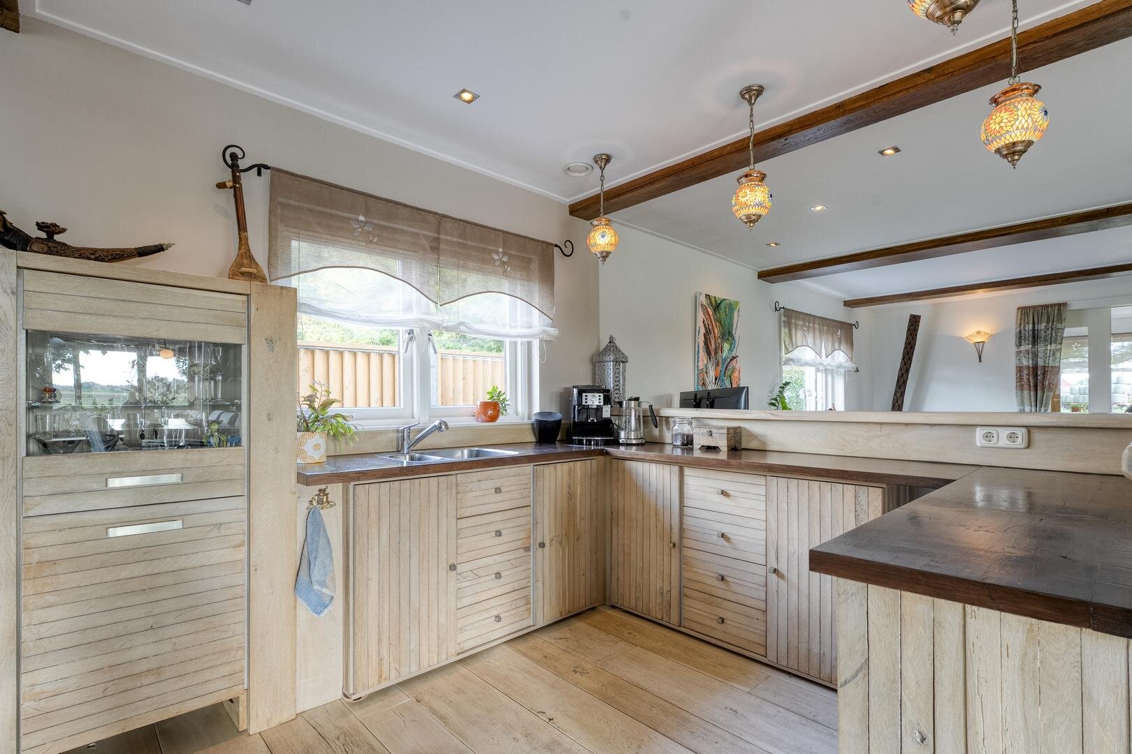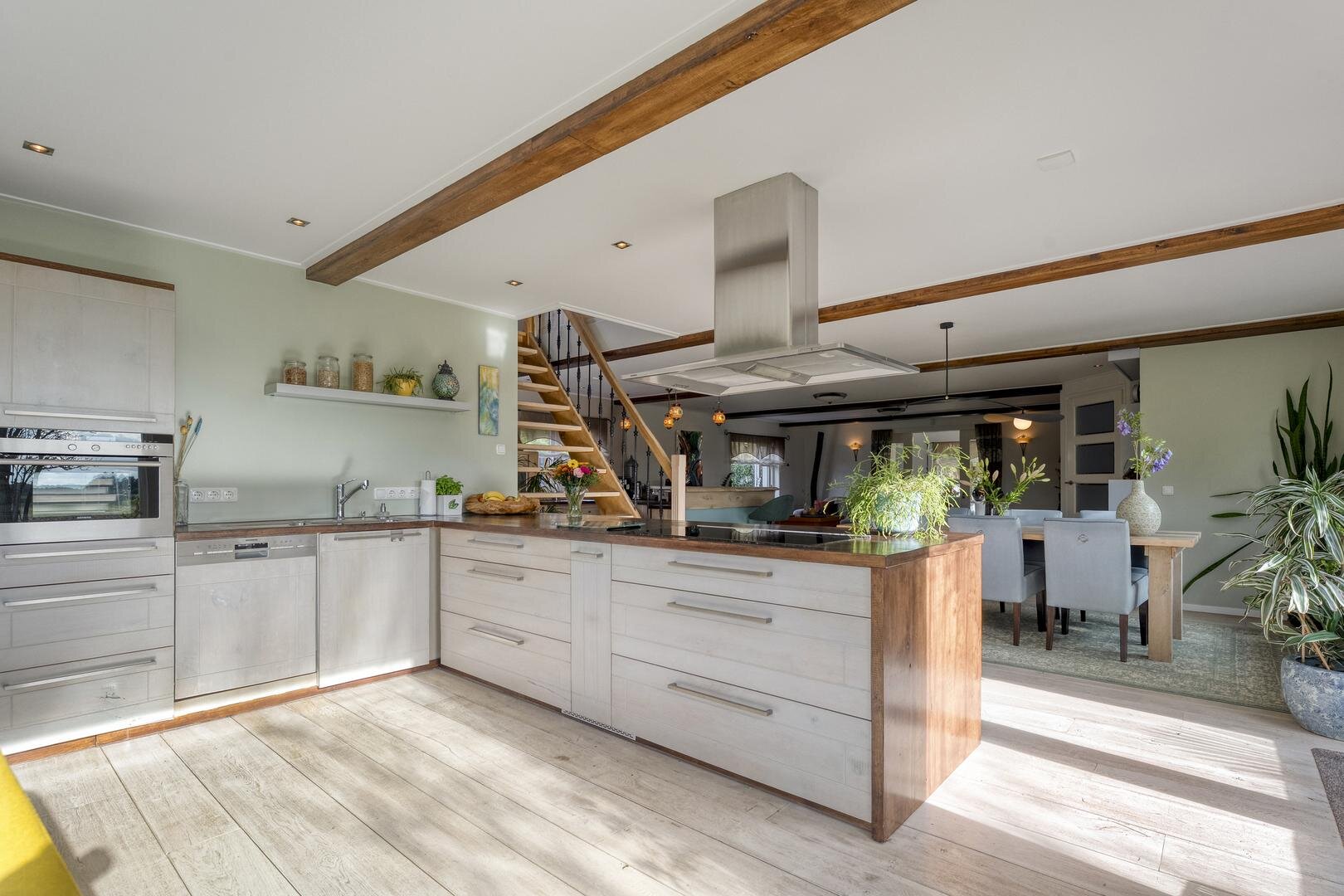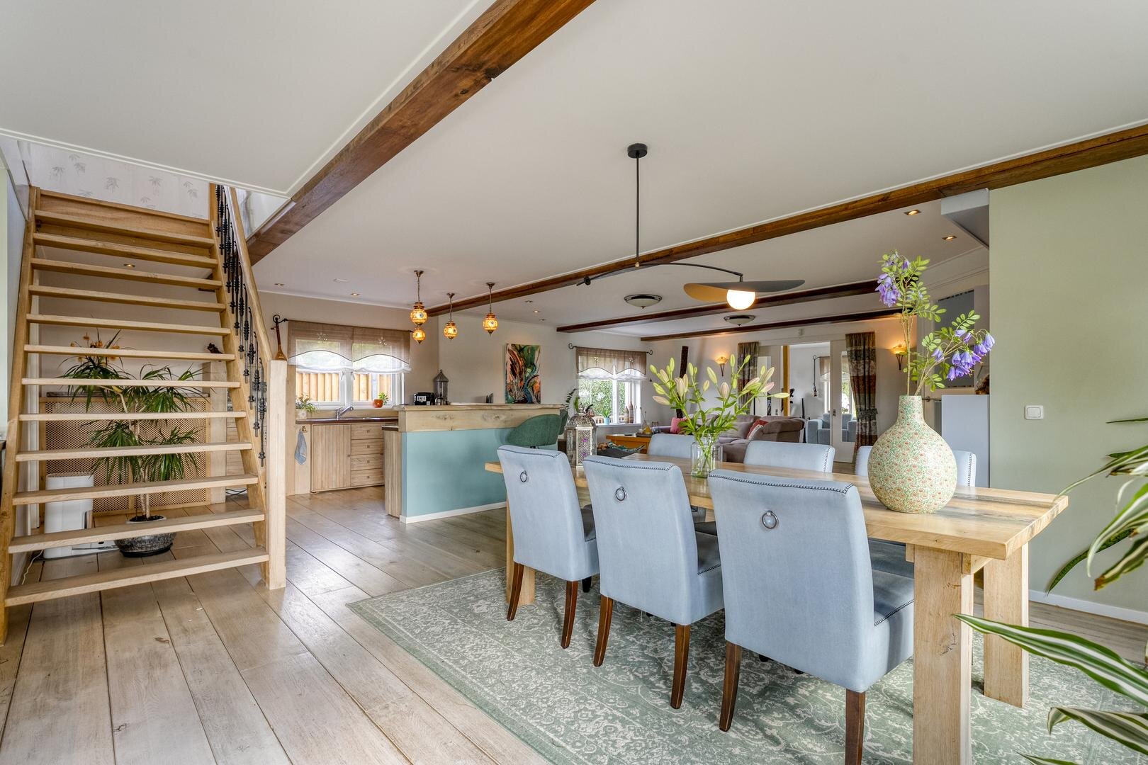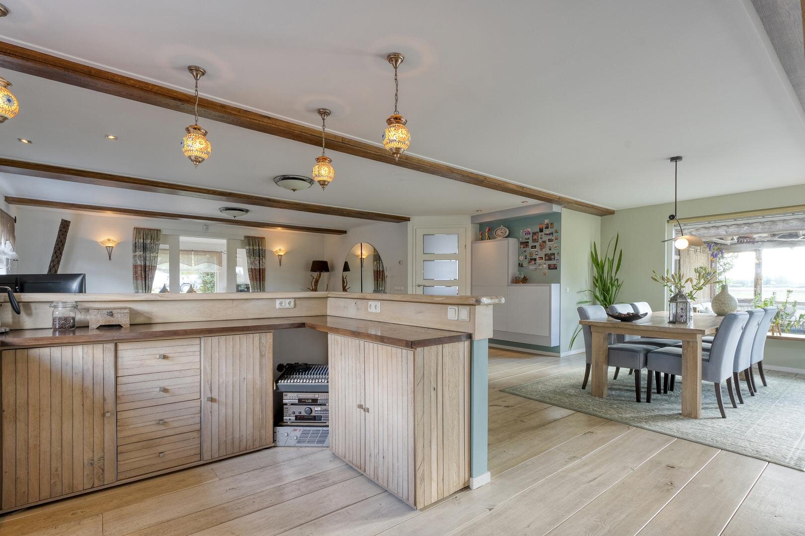 Met een woonoppervlakte van maar liefst 222 m² is er volop ruimte voor comfortabel wonen. De begane grond beschikt over een royale woonkeuken die in open verbinding staat met de woonkamer. De eikenhouten vloer, de keuken uitgevoerd in massief eiken en de trap van hout vormen samen een warm en stijlvol geheel. Karakteristieke accenten en een sfeervolle koffiebar versterken deze ambiance. Op de eerste verdieping loopt de eikenhouten vloer door en bevinden zich vier ruime slaapkamers en een bijzondere wellness-badkamer. Hier is gekozen voor bijpassende houten kasten en badkamermeubelen, terwijl de verhoogde jacuzzi centraal in de ruimte staat en een luxe uitstraling geeft.
