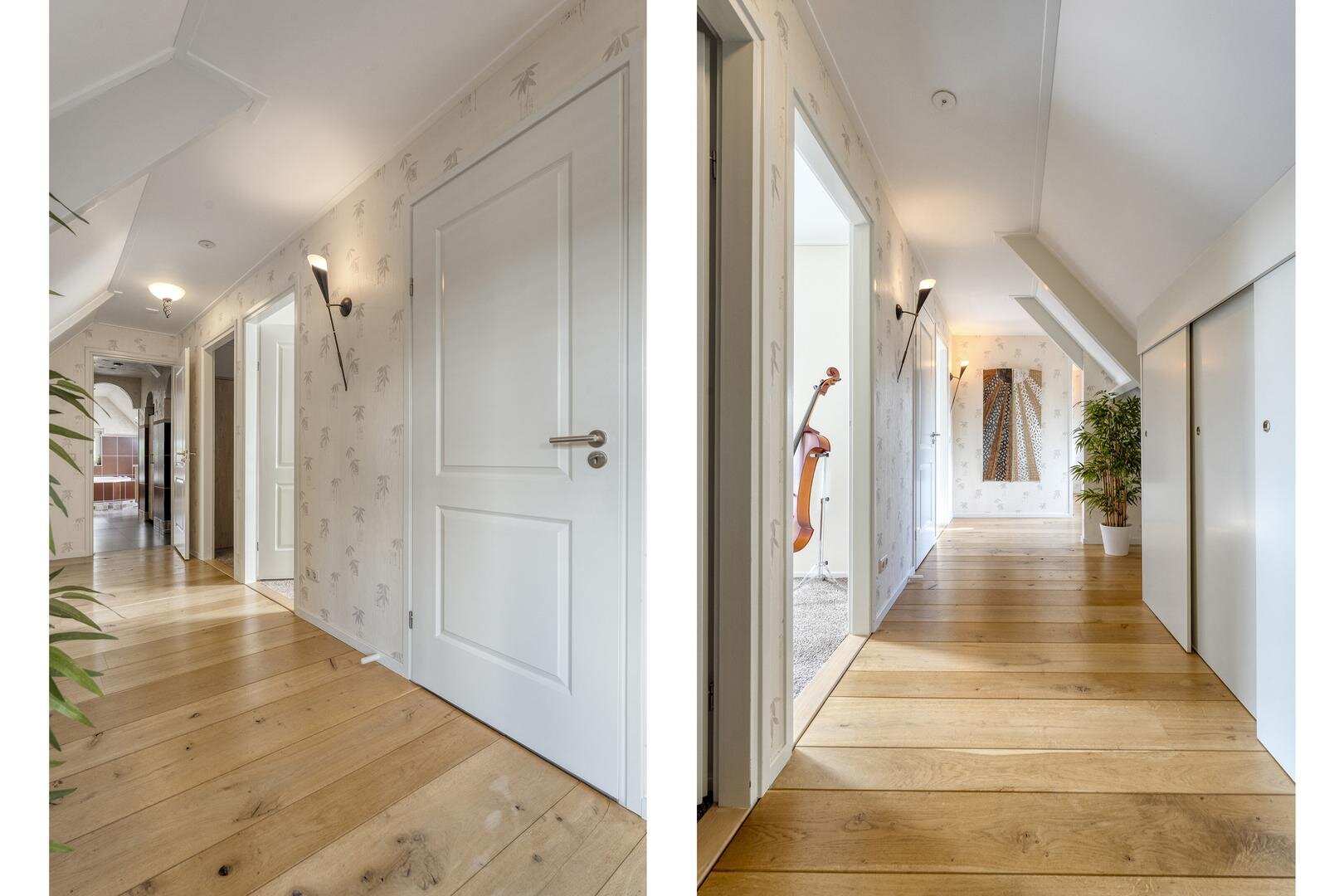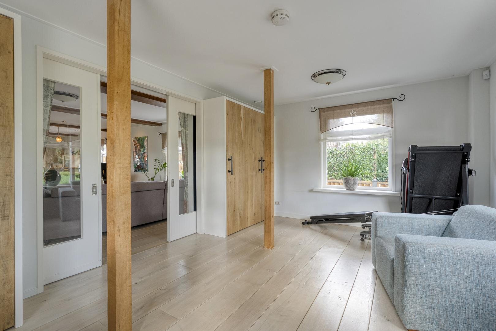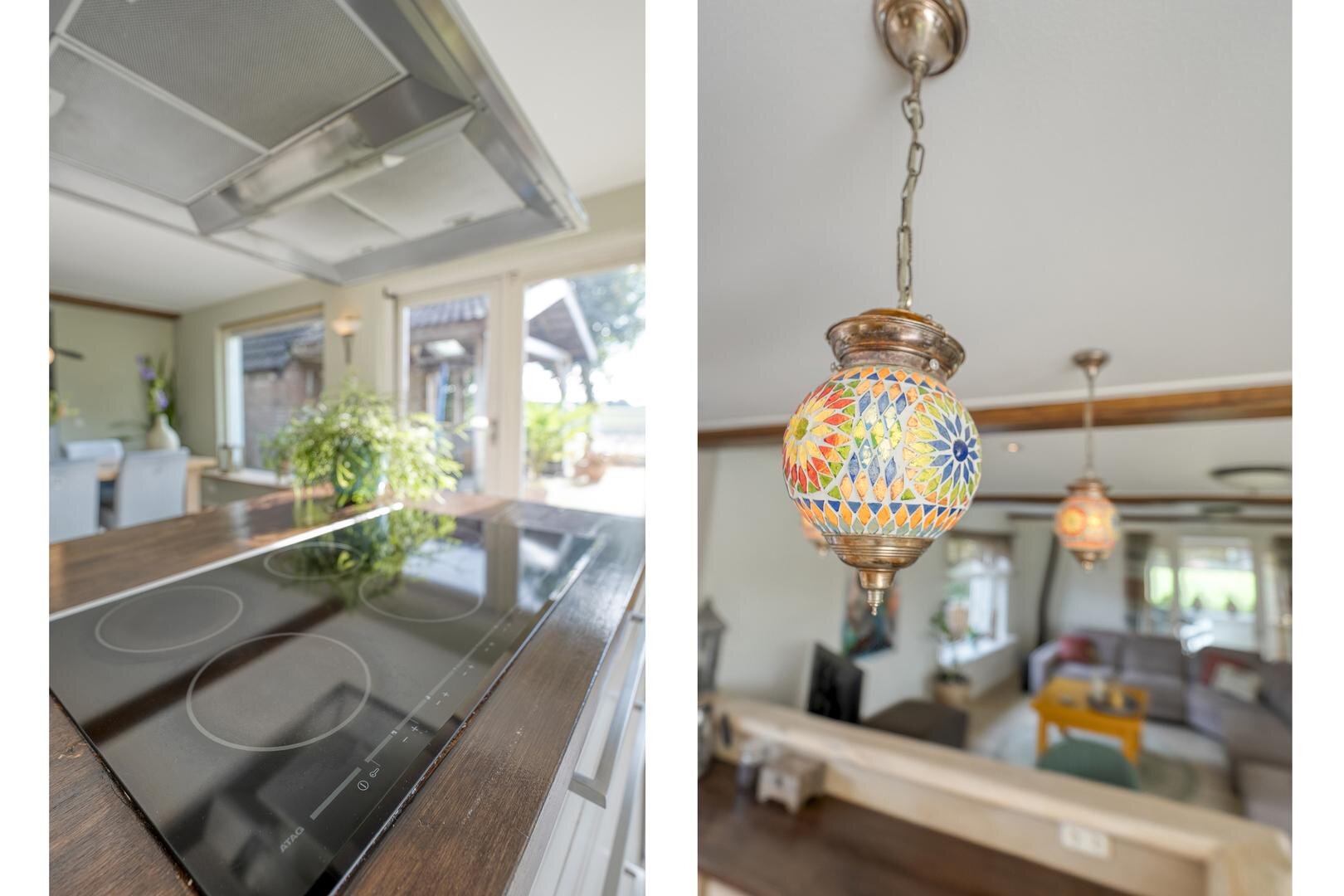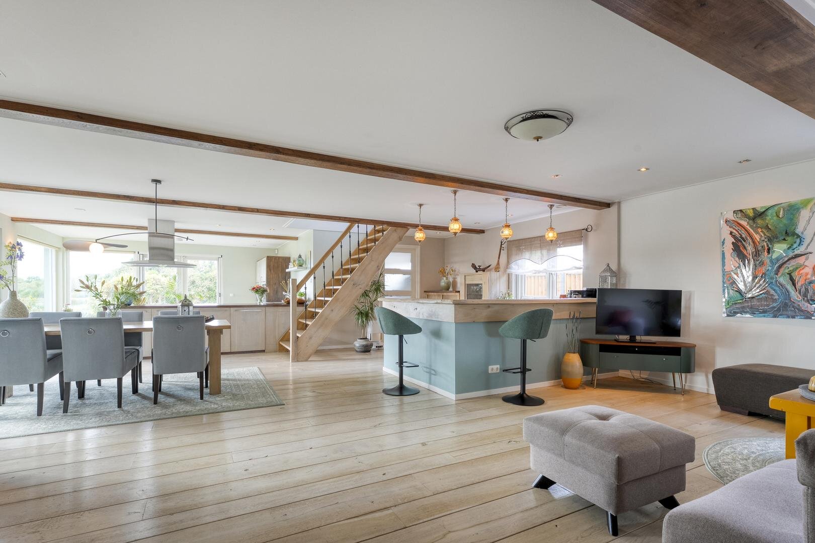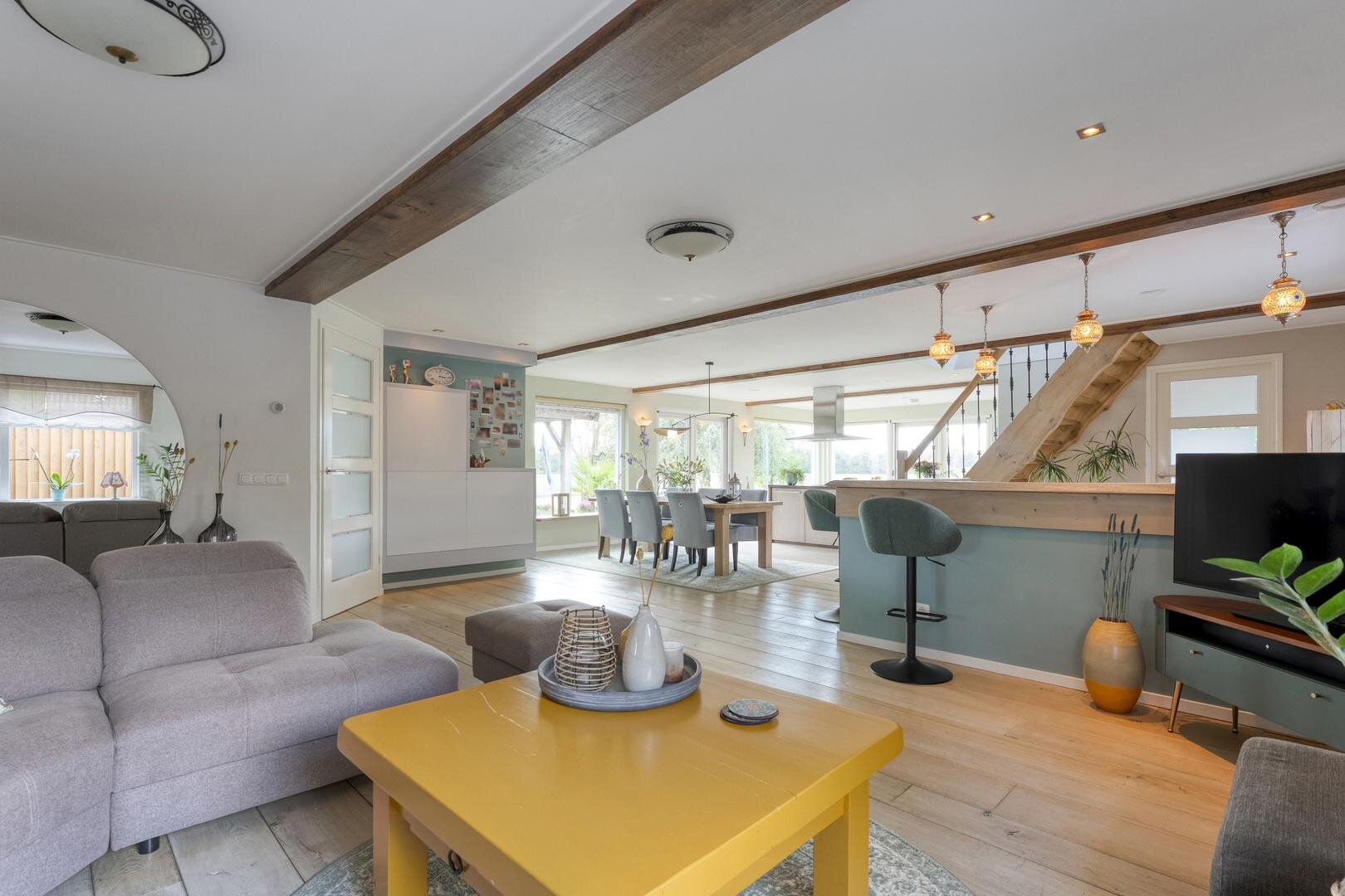 Met een woonoppervlakte van maar liefst 222 m² is er volop ruimte voor comfortabel wonen. De begane grond beschikt over een royale woonkeuken die in open verbinding staat met de woonkamer. De eikenhouten vloer, de keuken uitgevoerd in massief eiken en de trap van hout vormen samen een warm en stijlvol geheel. Karakteristieke accenten en een sfeervolle koffiebar versterken deze ambiance. Op de eerste verdieping loopt de eikenhouten vloer door en bevinden zich vier ruime slaapkamers en een bijzondere wellness-badkamer. Hier is gekozen voor bijpassende houten kasten en badkamermeubelen, terwijl de verhoogde jacuzzi centraal in de ruimte staat en een luxe uitstraling geeft.