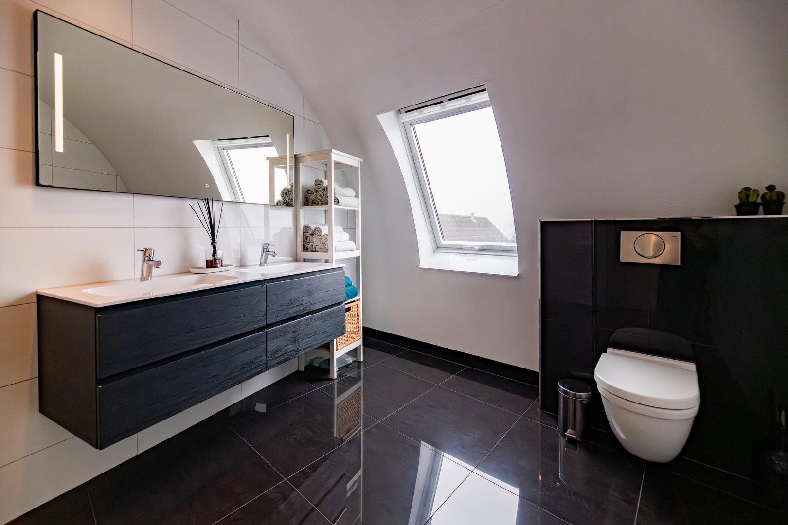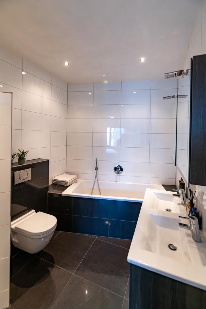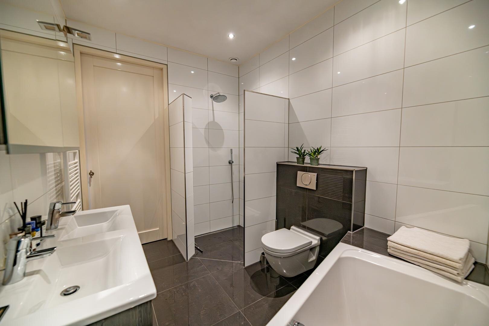 Toilet. Twee slaapkamers waarvan één met inloopkast en badkamer voorzien van ligbad, toilet, dubbel wastafelmeubel en inloopdouche.