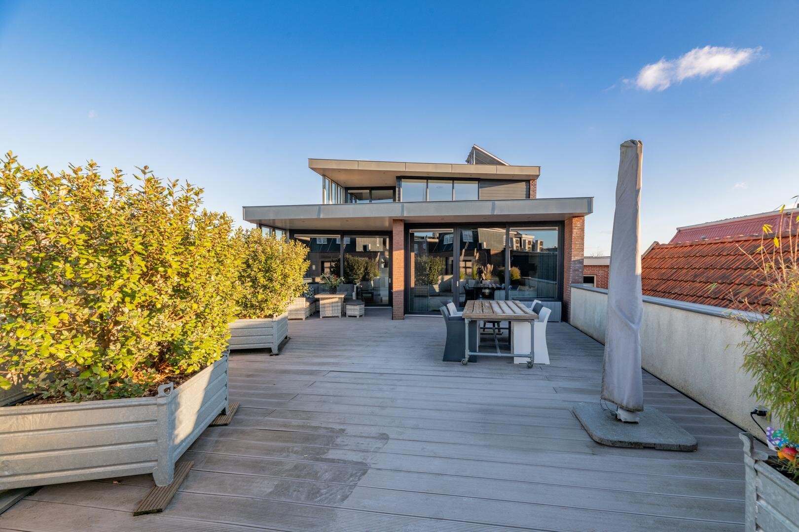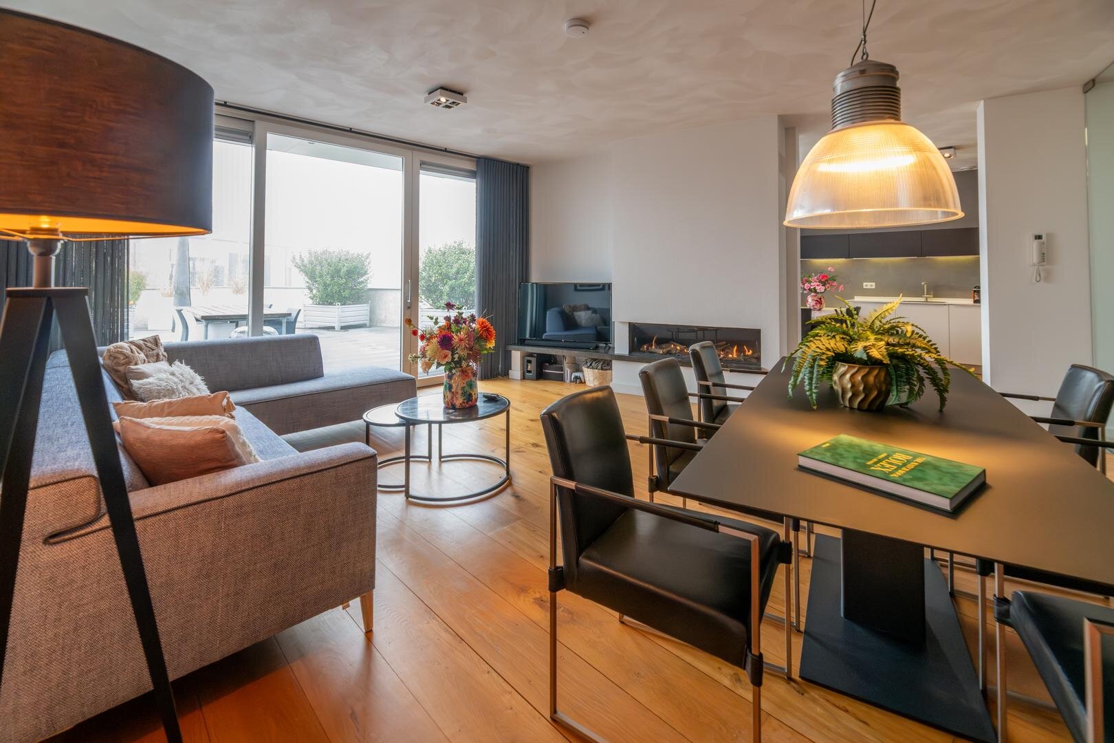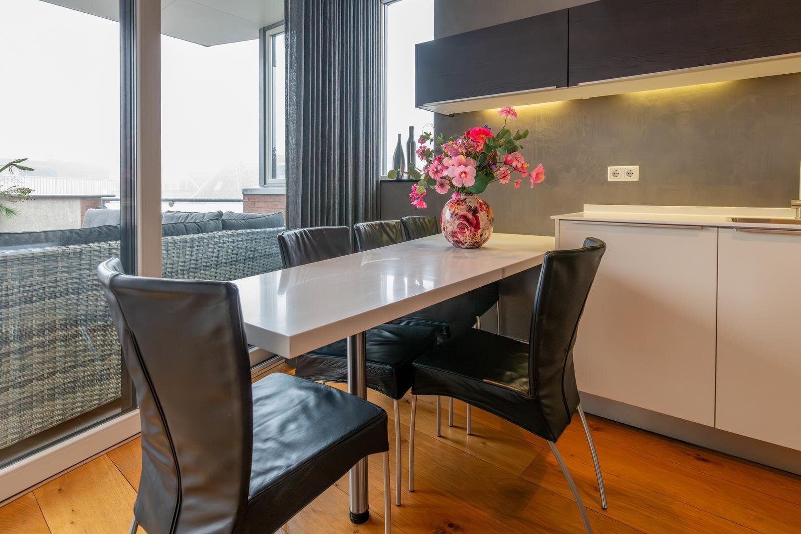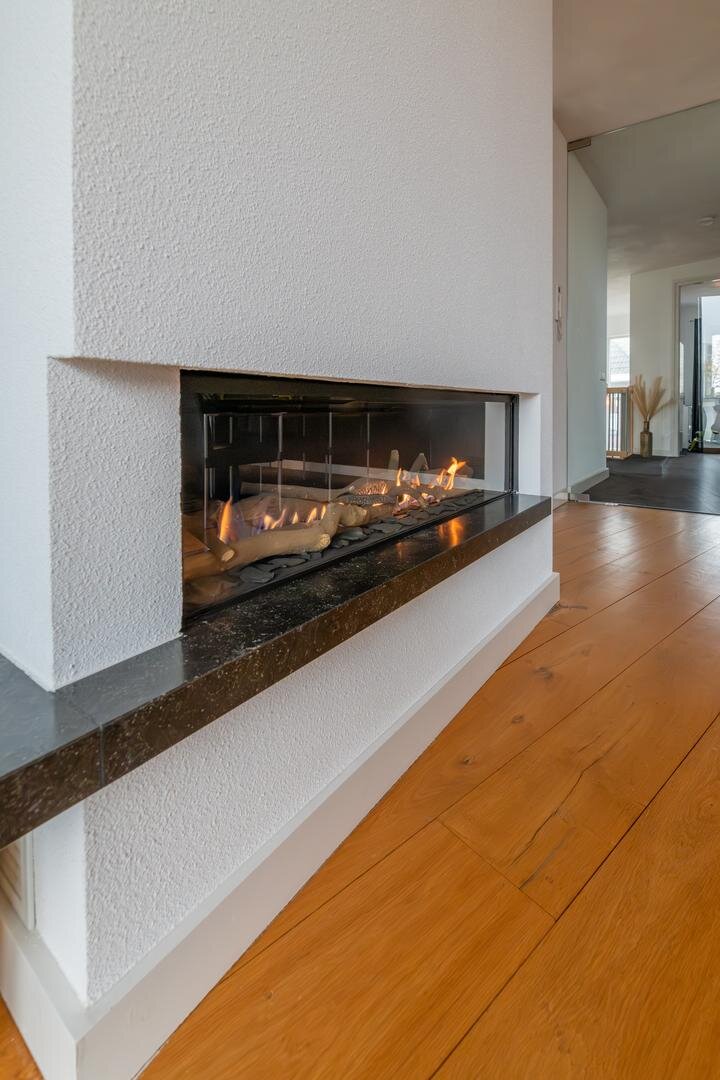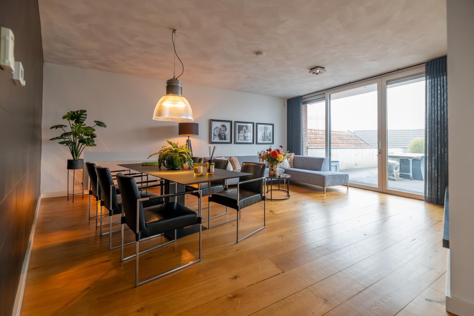 De grote woonkamer vormt het kloppend hart van het huis en wordt versterkt door hoge plafonds, een massief eikenhouten vloer en een sfeervolle gashaard met een stijlvolle natuurstenen afwerking. Vanuit hier kijk je uit over het grote dakterras, dat is afgewerkt met onderhoudsvriendelijk keralit en een prachtig uitzicht biedt over de stad.