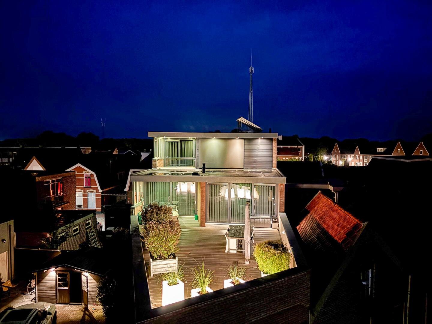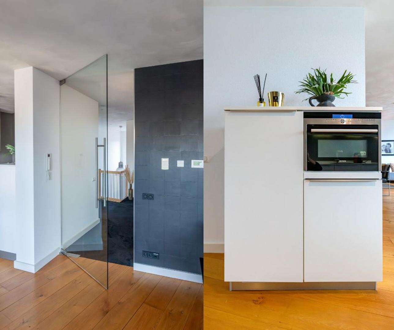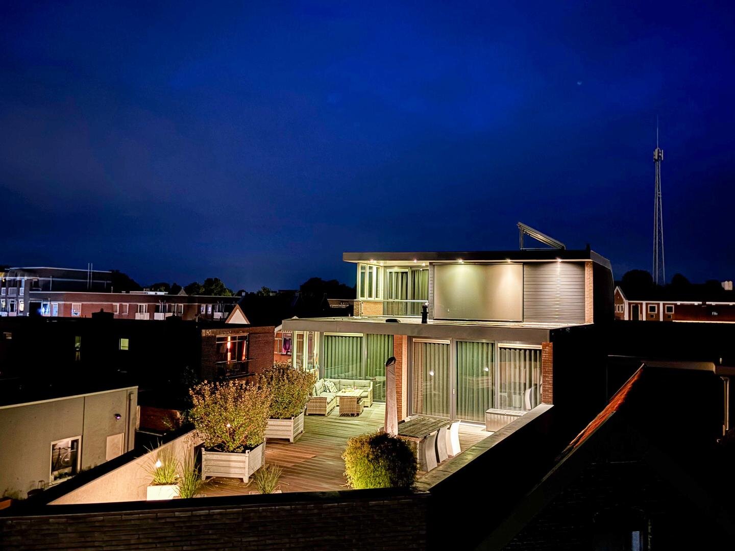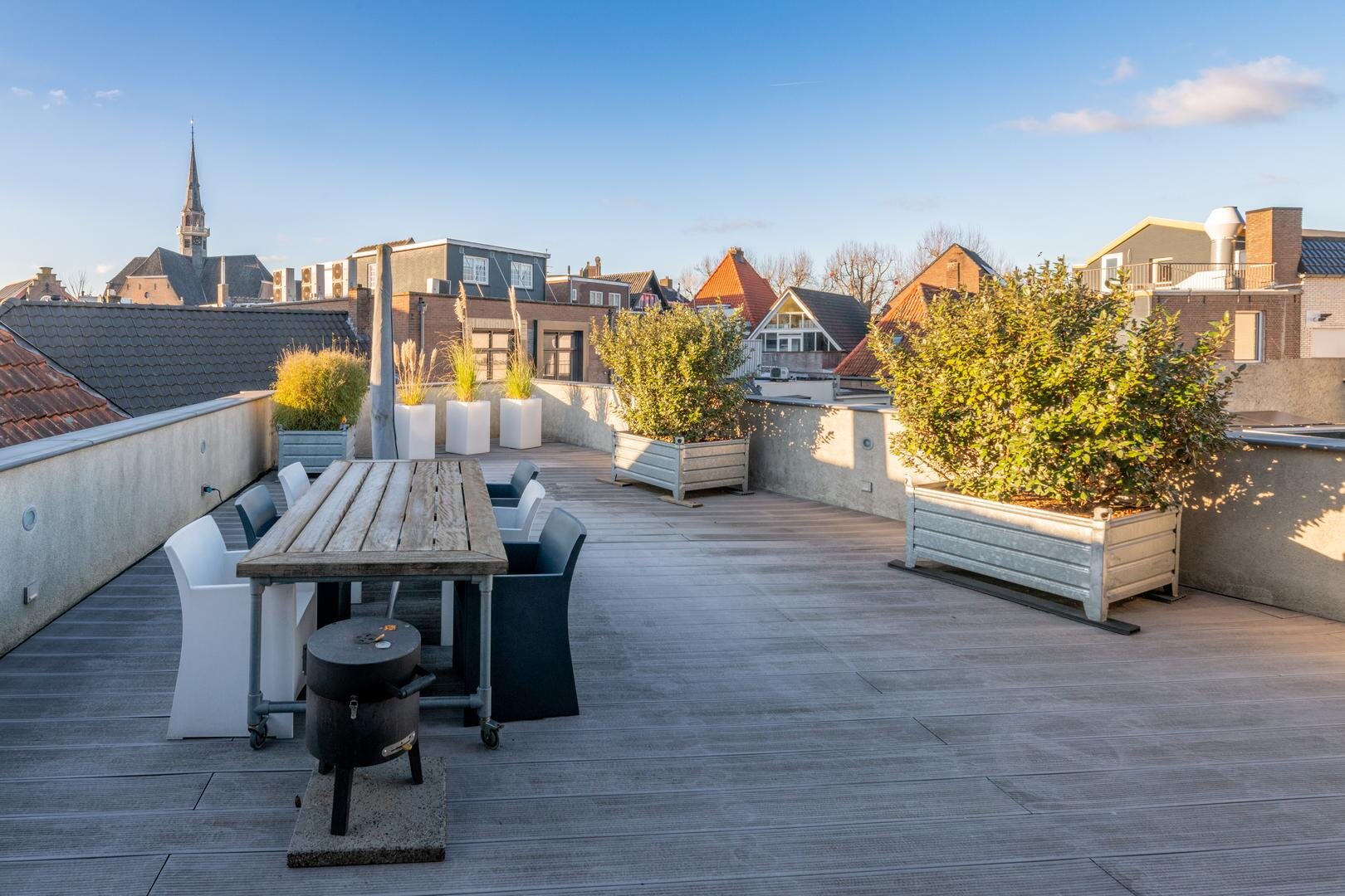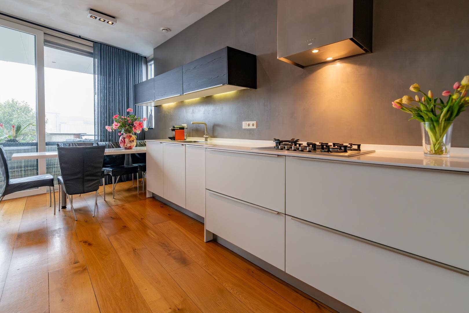 De grote woonkamer vormt het kloppend hart van het huis en wordt versterkt door hoge plafonds, een massief eikenhouten vloer en een sfeervolle gashaard met een stijlvolle natuurstenen afwerking. Vanuit hier kijk je uit over het grote dakterras, dat is afgewerkt met onderhoudsvriendelijk keralit en een prachtig uitzicht biedt over de stad.