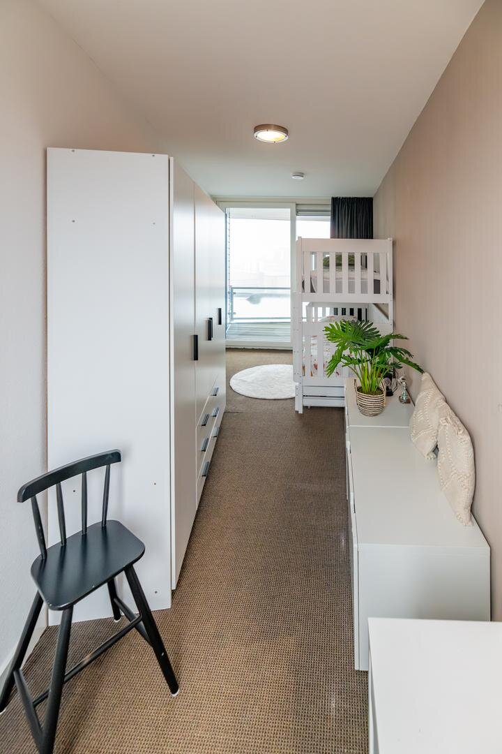 Ook vanuit andere delen van de woning geniet je van dit vrije en levendige stadsbeeld.