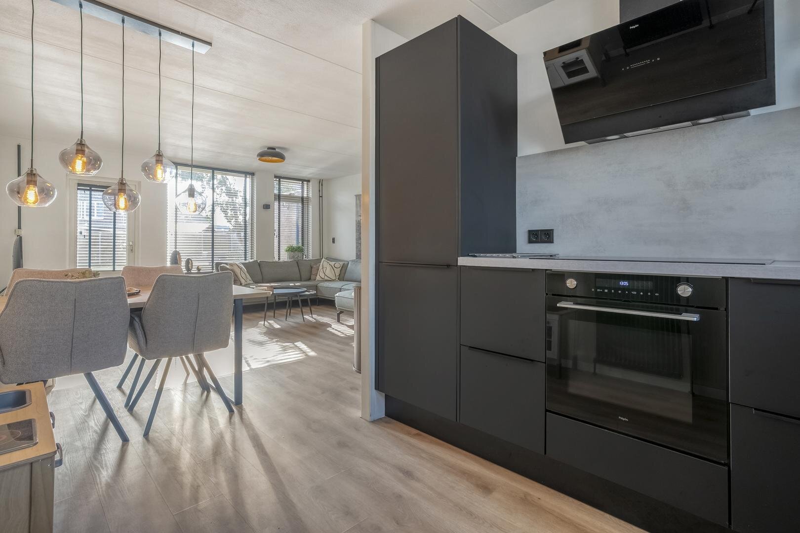 Begane grond: Entree met toilet en trap naar de eerste verdieping. Was/cv ruimte. Ruime woonkamer met deur naar de achtertuin en voorzien van pvc vloer. Open keuken uit 2022 voorzien van inductiekookplaat, afzuigkap, vaatwasser, combi-oven, koelkast en vriezer.
