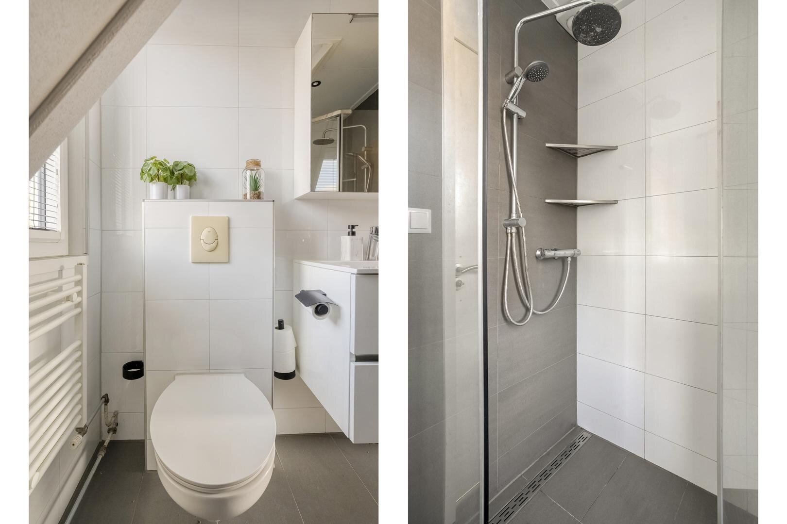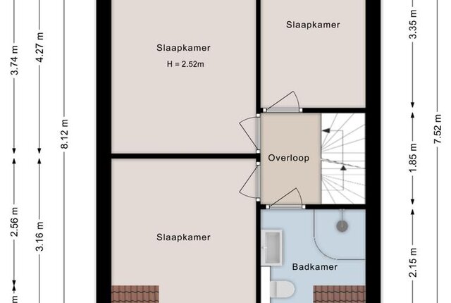 Eerste verdieping: Overloop. Drie slaapkamers. Badkamer voorzien van wastafelmeubel, douche en toilet.