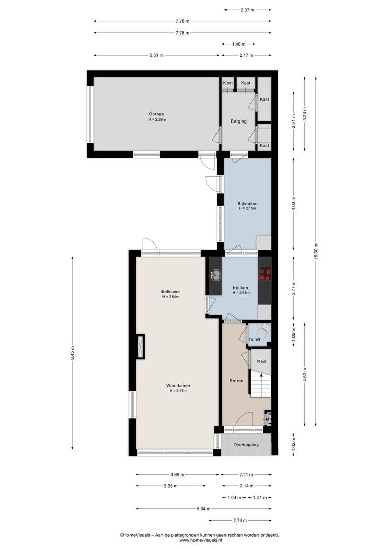 Begane grond: Hal/entree met toilet. Woonkamer, met veel lichtinval, voorzien van een laminaatvloer en erker. Dichte keuken met apparatuur: keramische kookplaat, vaatwasser, afzuigkap, koelkast en oven. Bijkeuken voorzien van wasmachineaansluiting en geïsoleerde wanden en dak. Deze biedt toegang tot de berging met veel opbergruimte en stenen garage.