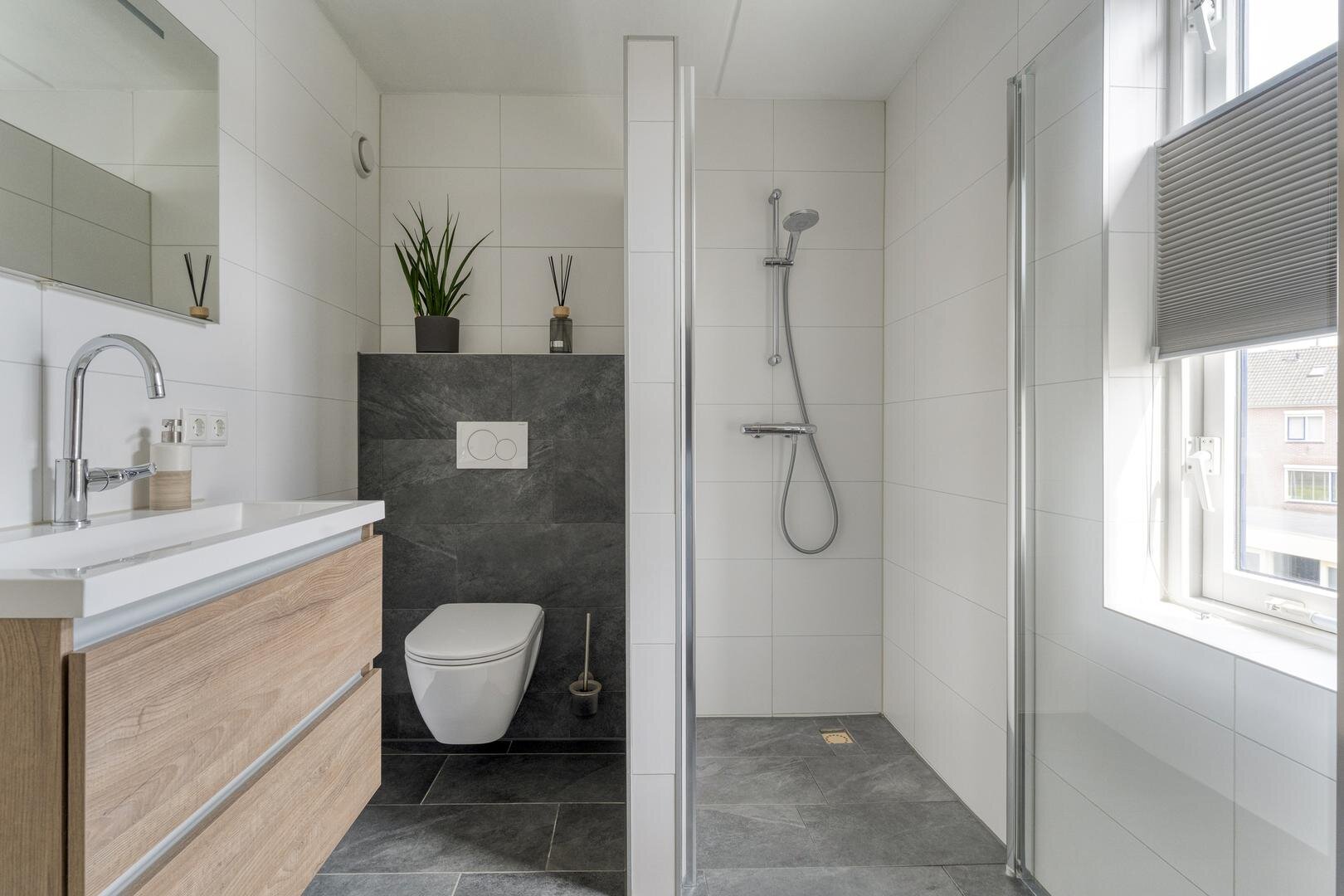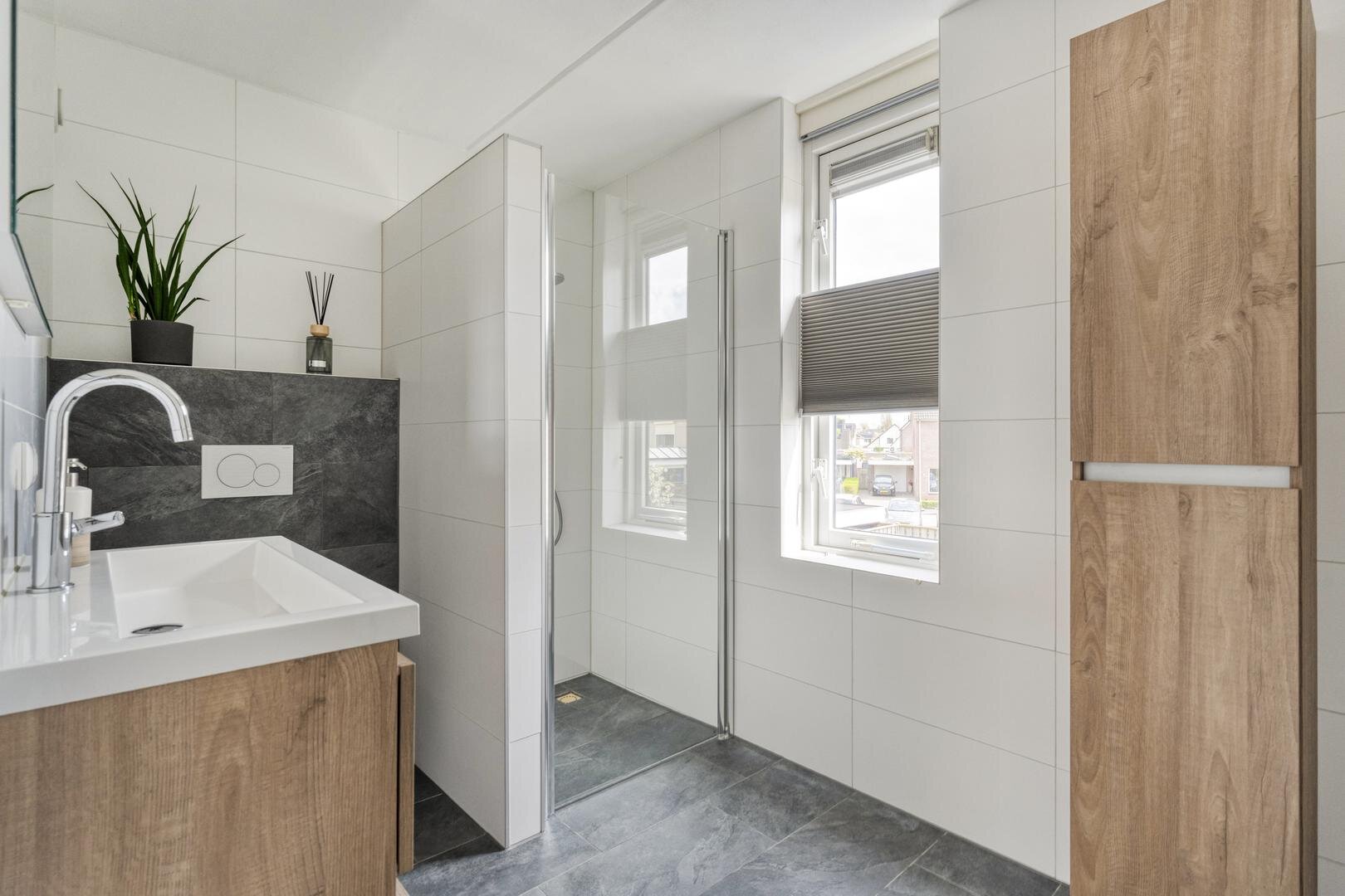 Eerste verdieping: overloop. 3 Slaapkamers voorzien van laminaatvloer en 1 met rolluiken. Badkamer met inloopdouche, wastafel en meubel, toilet.