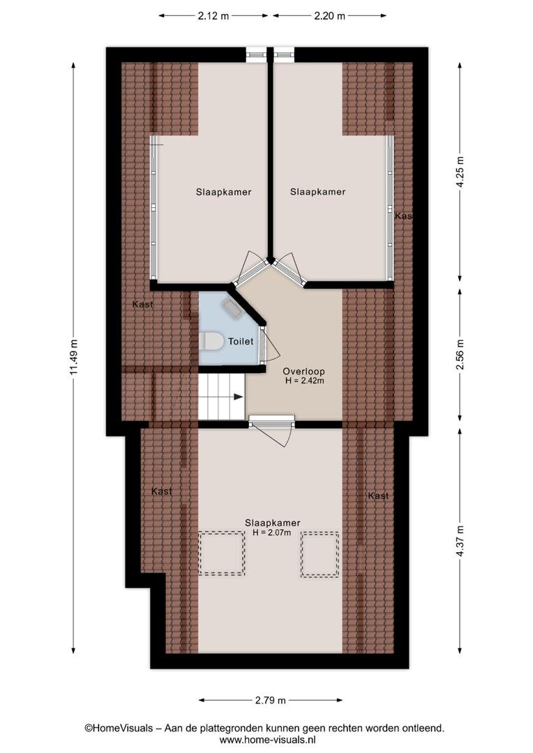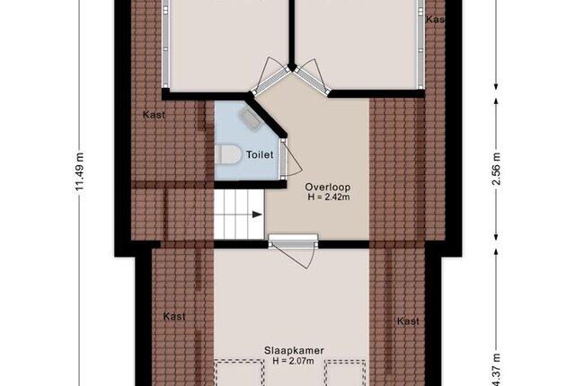 Eerste verdieping: overloop met toilet. Drie slaapkamers, allen voorzien van een laminaatvoer.