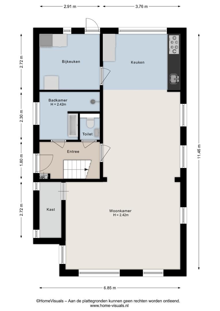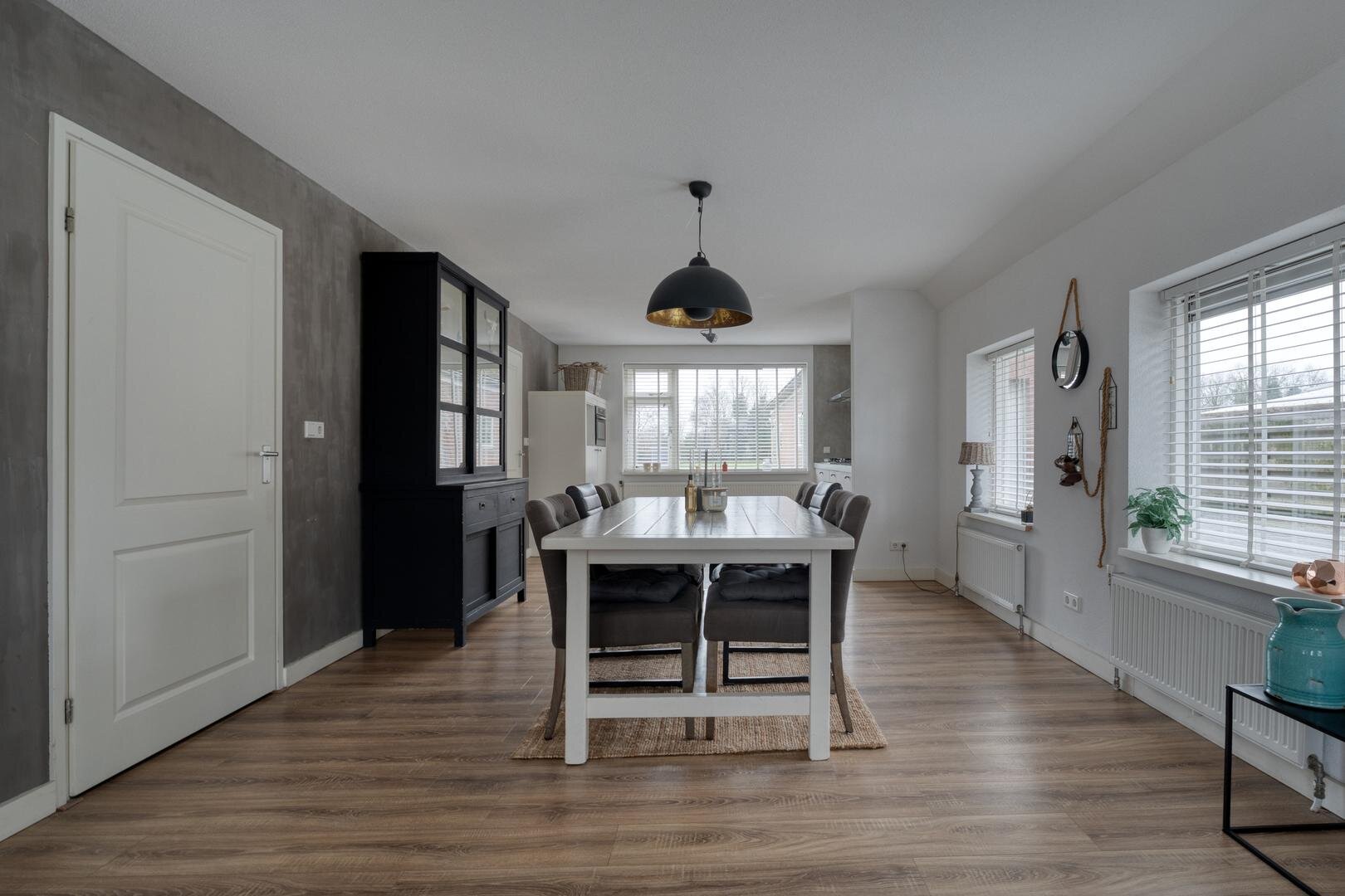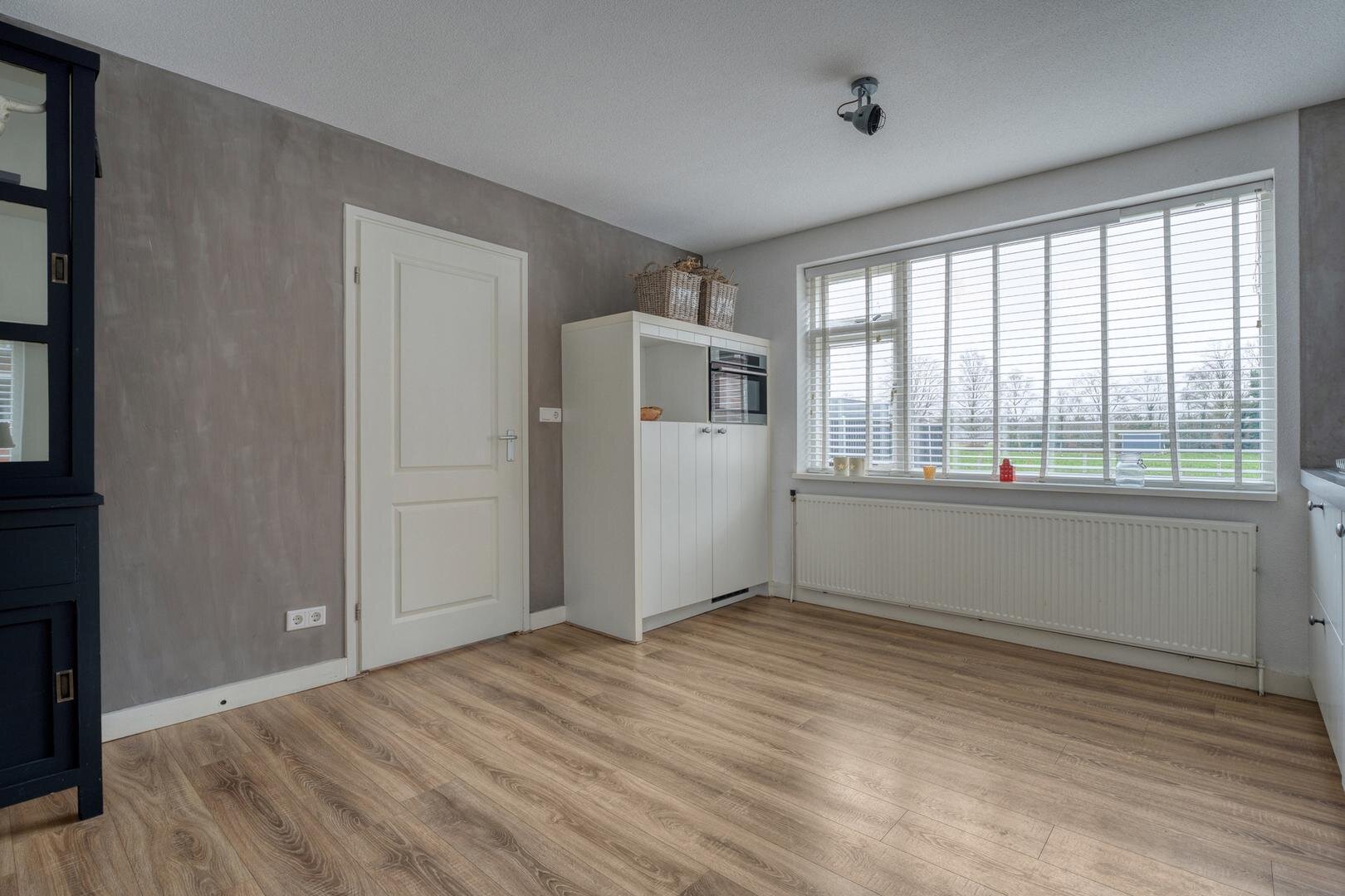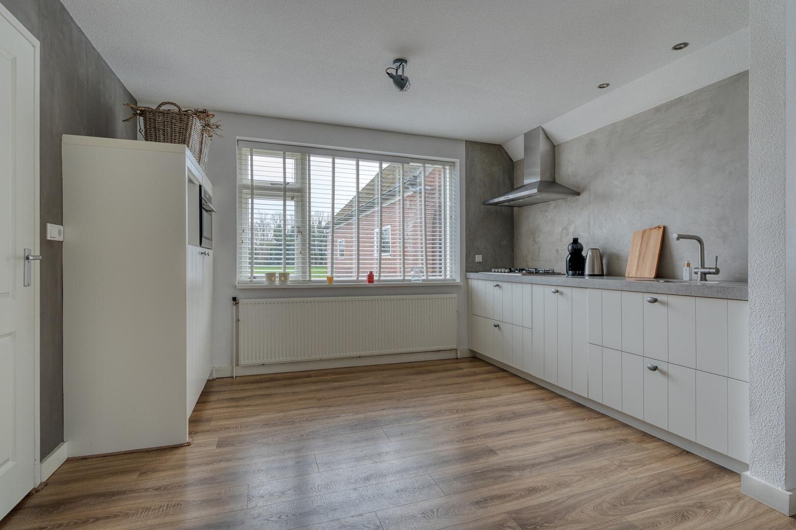 Woonkamer met laminaatvloer. Open keuken voorzien van apparatuur: 5-pits gastoestel, afzuigkap, vaatwasser, koelkast en combi-oven. Bijkeuken met wasmachineaansluiting. Vrijstaande stenen garage met vliering.