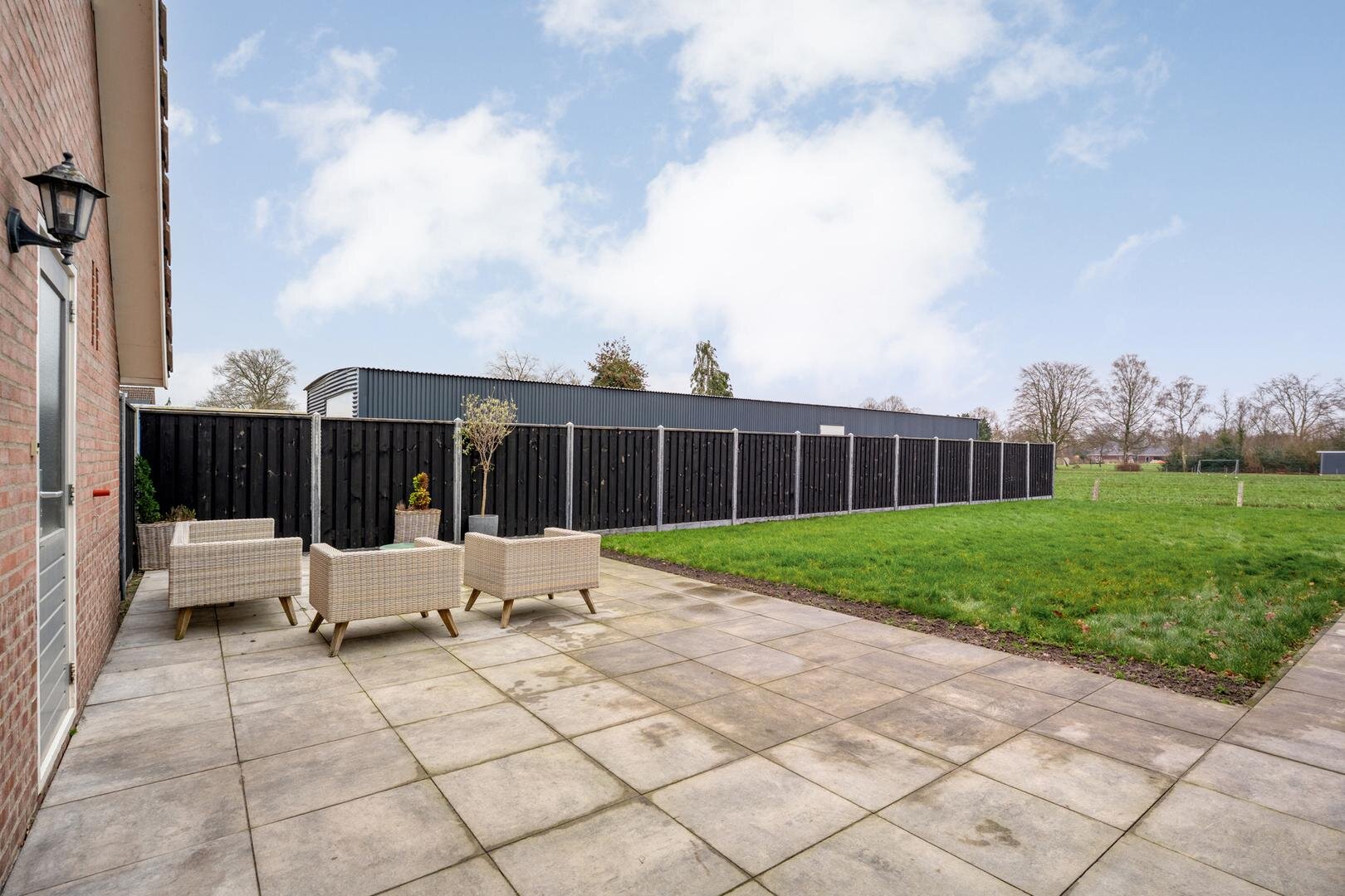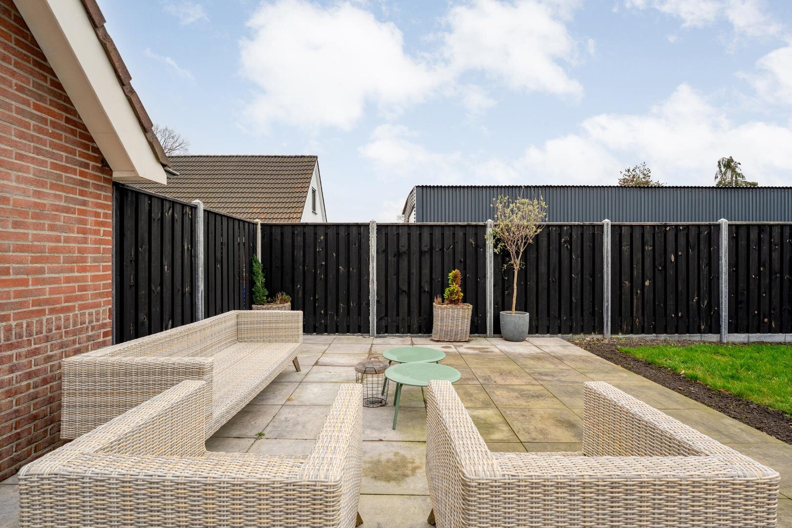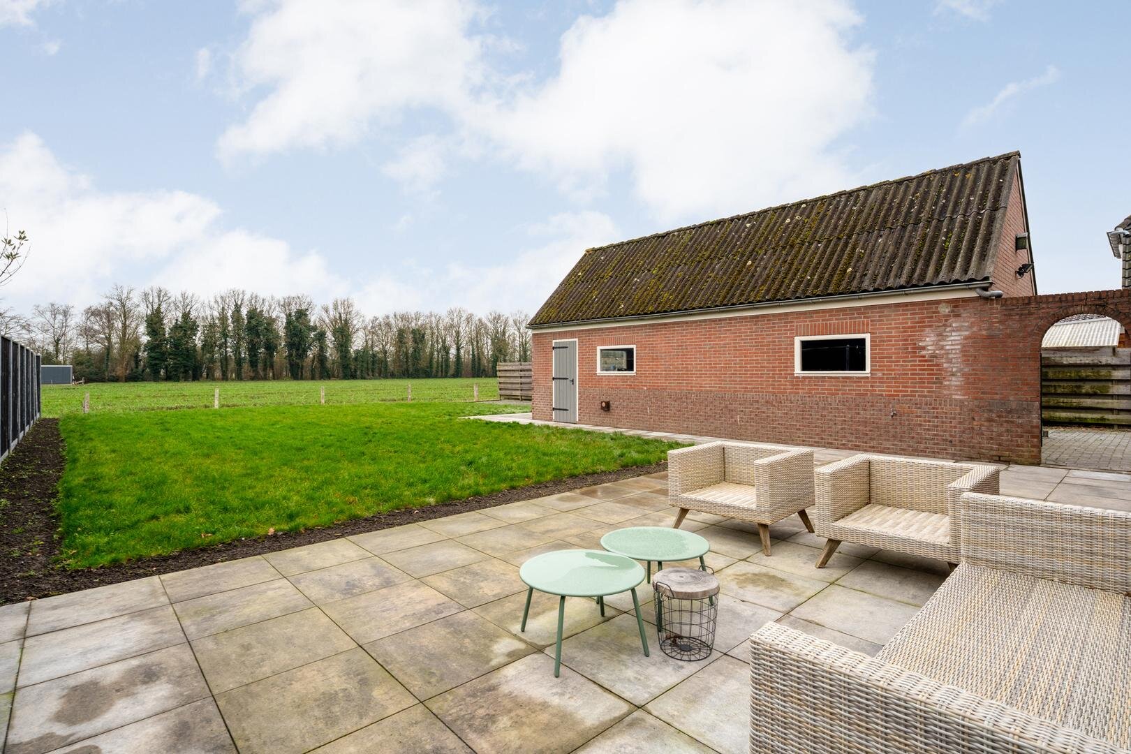 De ruime achtertuin grenst direct aan de omliggende weilanden en biedt veel privacy en een vrij uitzicht. Een fijne plek om tot rust te komen en te genieten van het buitenleven.