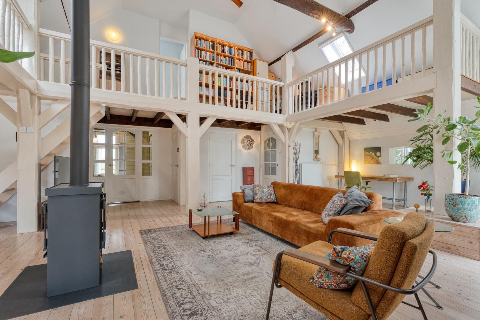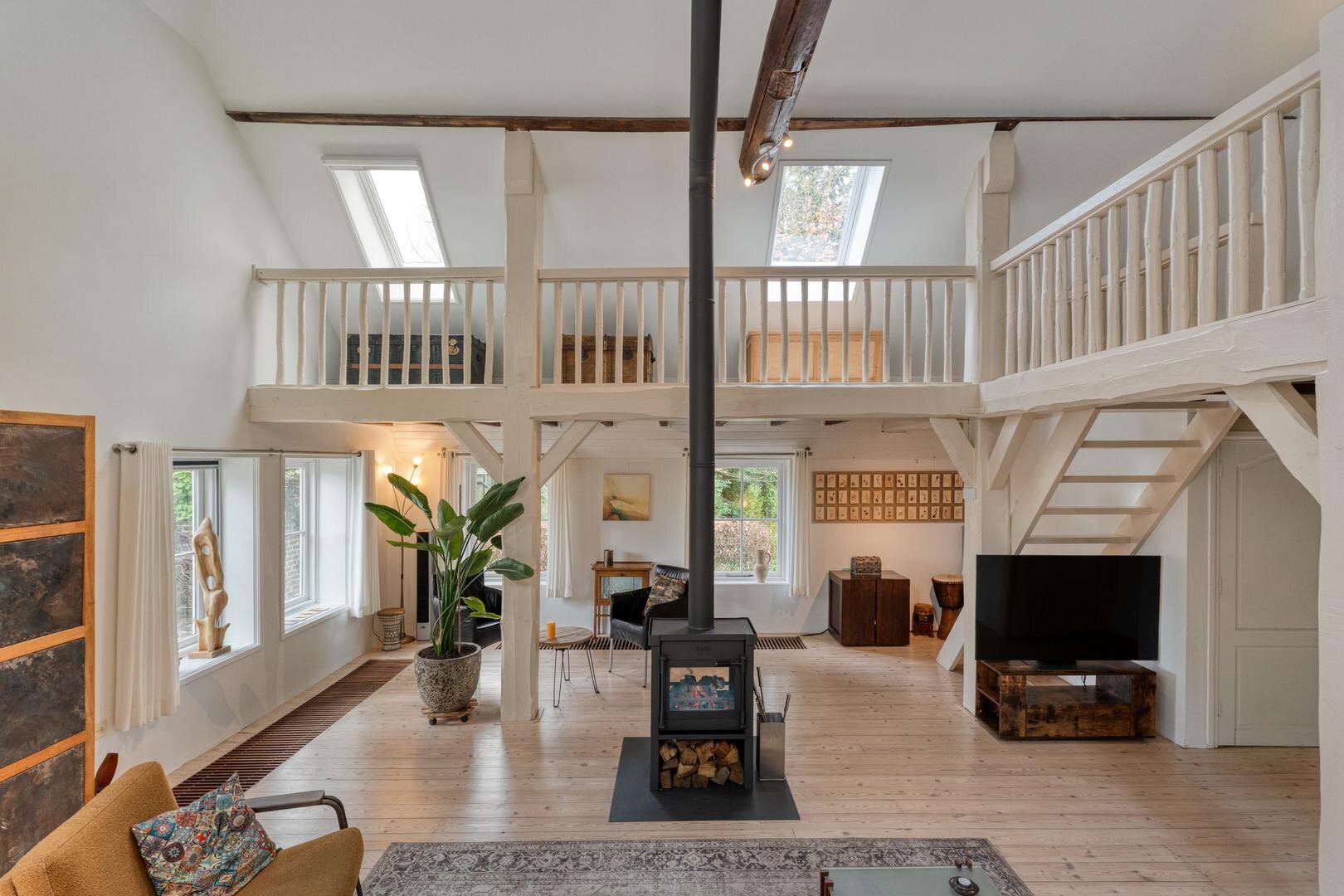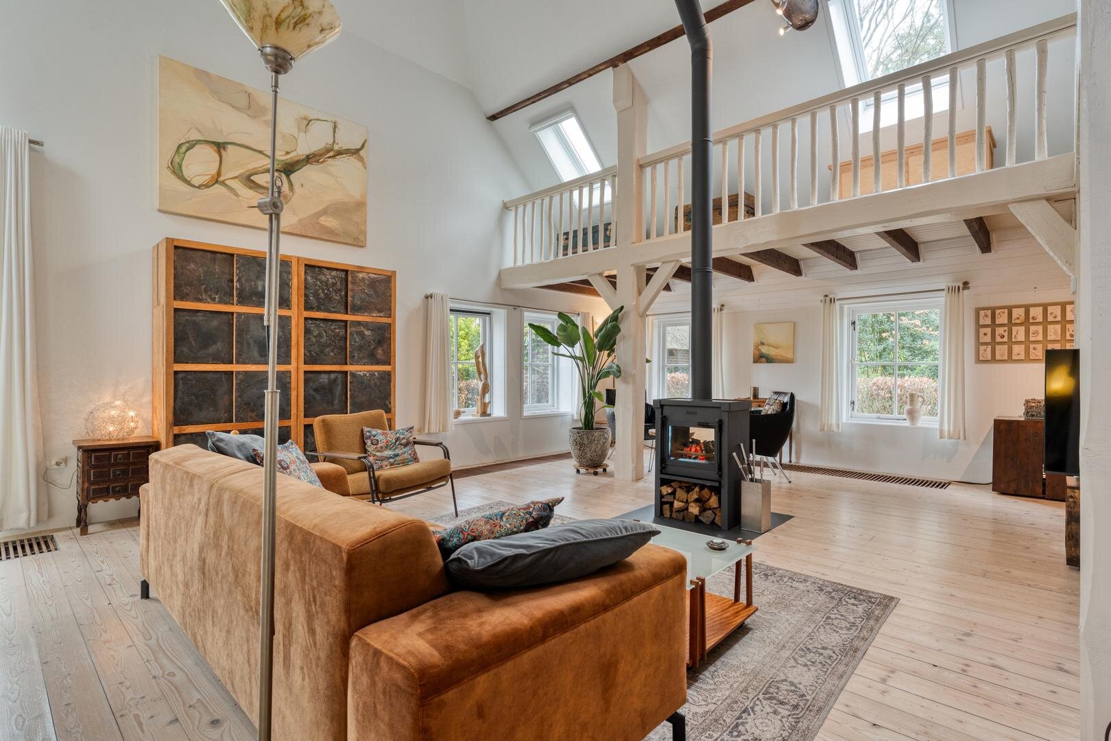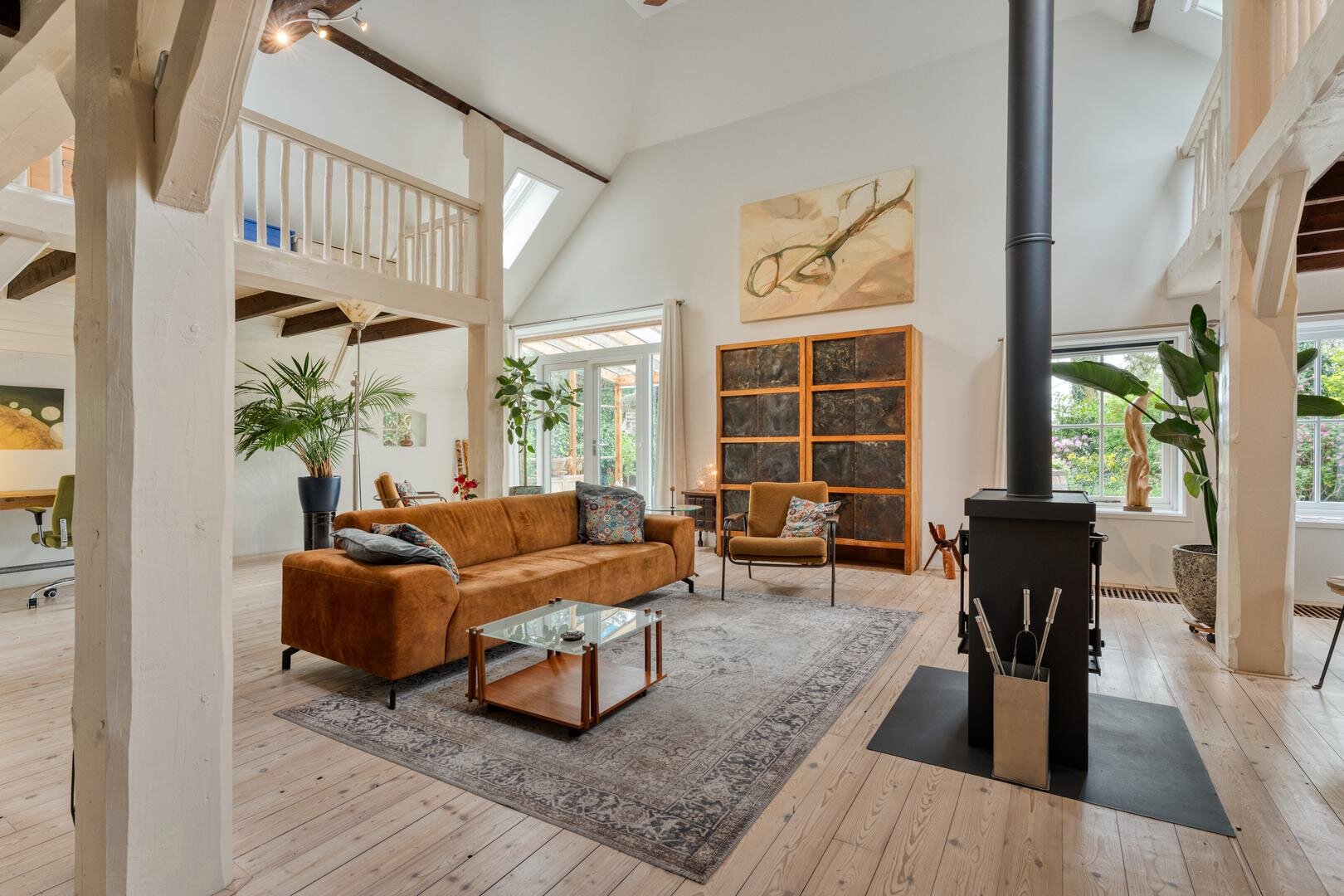 De woonkamer met houtkachel vormt het hart van de woning en maakt direct indruk door de prachtige vide, die herinnert aan de oude stal die hier ooit was. De zichtbare gebinten en de karakteristieke stalraampjes geven de ruimte een warme en authentieke uitstraling. Aangrenzend aan de woonkamer bevindt zich de royale woonkeuken, waar binnen en buiten op natuurlijke wijze in elkaar overlopen en je het hele jaar door geniet van het uitzicht op de tuin en het omliggende groen.