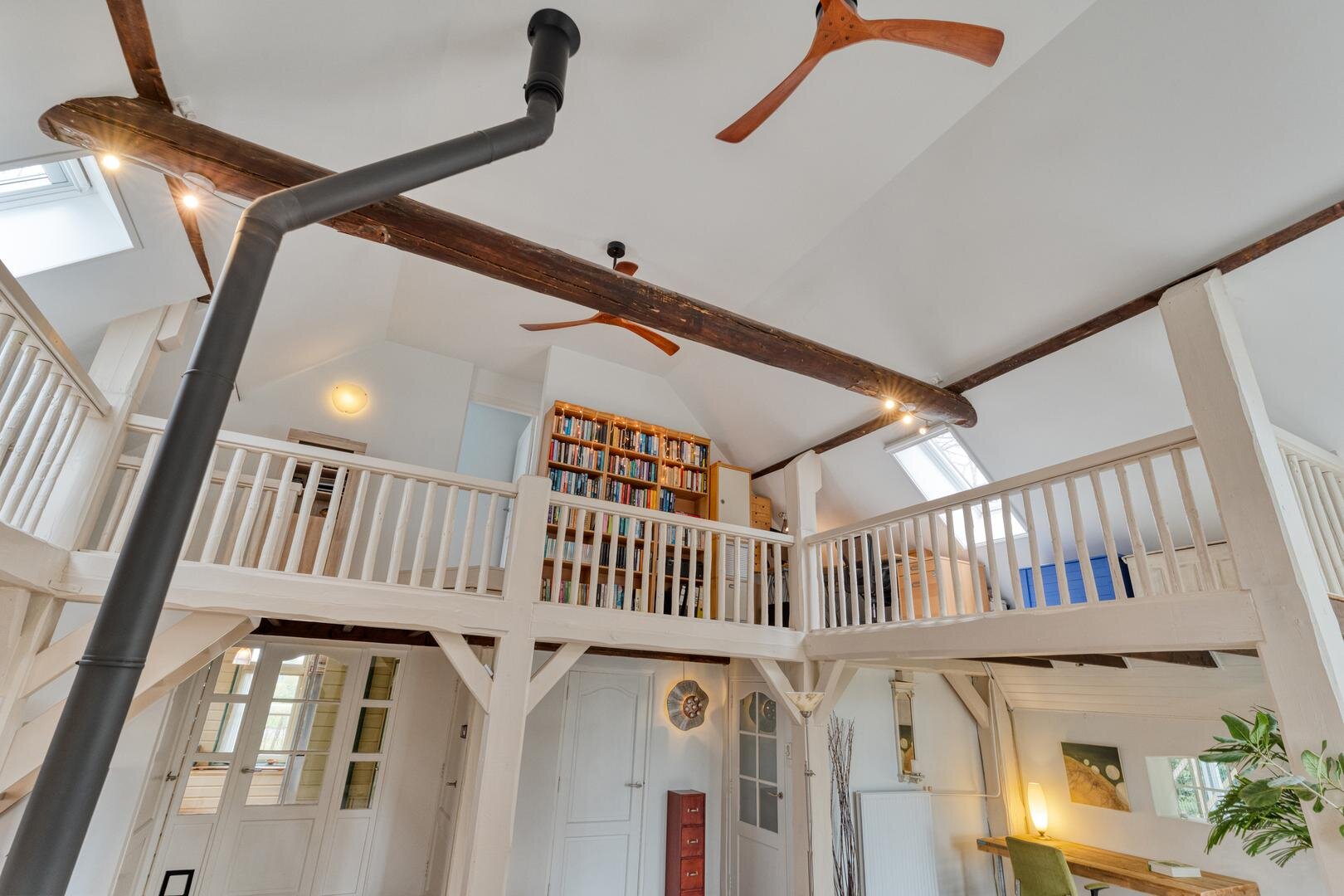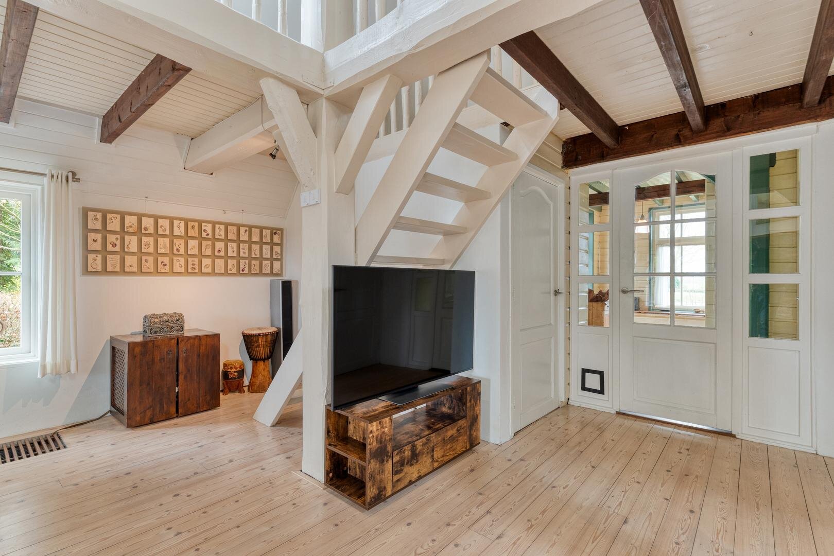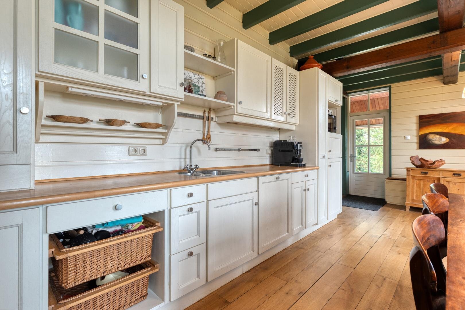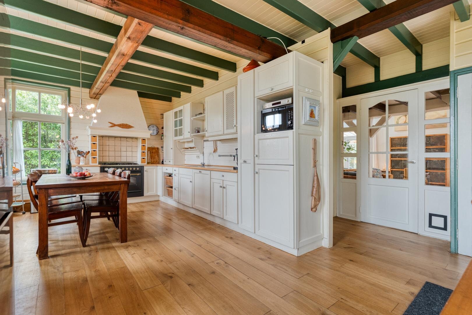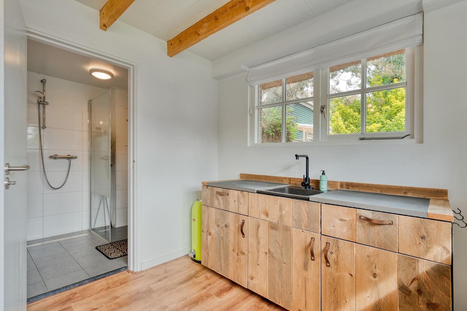 De woonkamer met houtkachel vormt het hart van de woning en maakt direct indruk door de prachtige vide, die herinnert aan de oude stal die hier ooit was. De zichtbare gebinten en de karakteristieke stalraampjes geven de ruimte een warme en authentieke uitstraling. Aangrenzend aan de woonkamer bevindt zich de royale woonkeuken, waar binnen en buiten op natuurlijke wijze in elkaar overlopen en je het hele jaar door geniet van het uitzicht op de tuin en het omliggende groen.