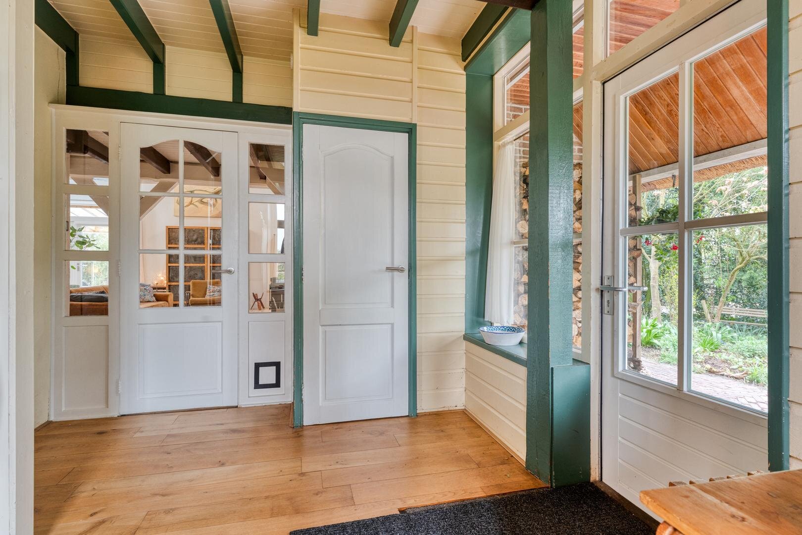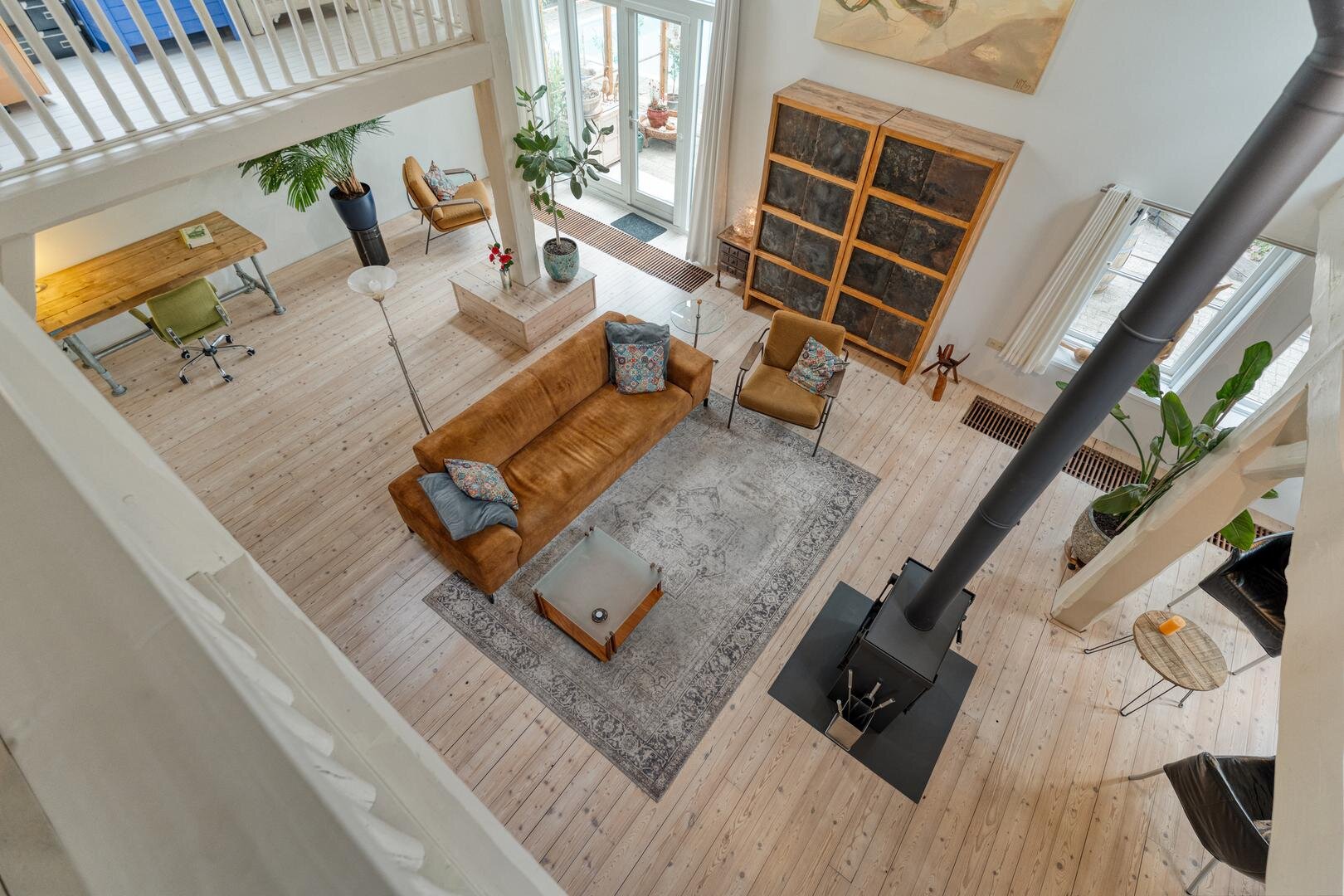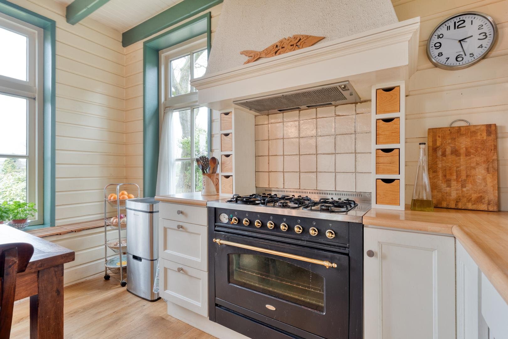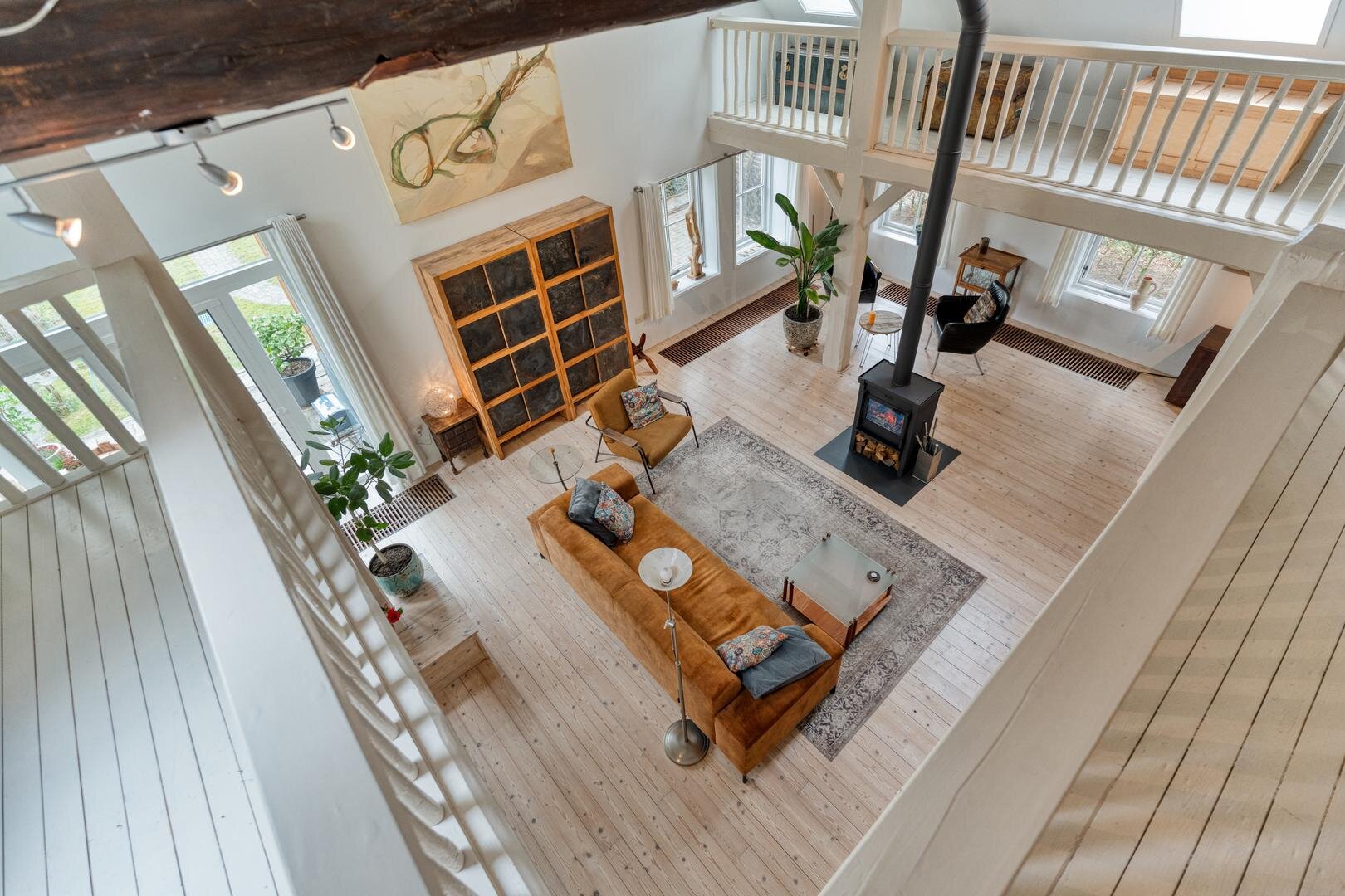De woonkamer met houtkachel vormt het hart van de woning en maakt direct indruk door de prachtige vide, die herinnert aan de oude stal die hier ooit was. De zichtbare gebinten en de karakteristieke stalraampjes geven de ruimte een warme en authentieke uitstraling. Aangrenzend aan de woonkamer bevindt zich de royale woonkeuken, waar binnen en buiten op natuurlijke wijze in elkaar overlopen en je het hele jaar door geniet van het uitzicht op de tuin en het omliggende groen.