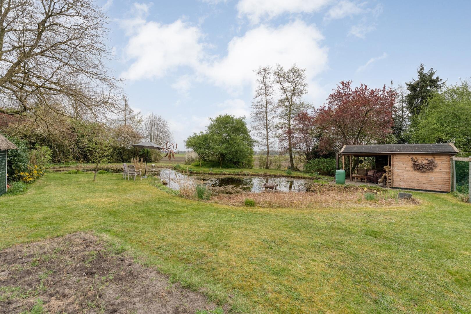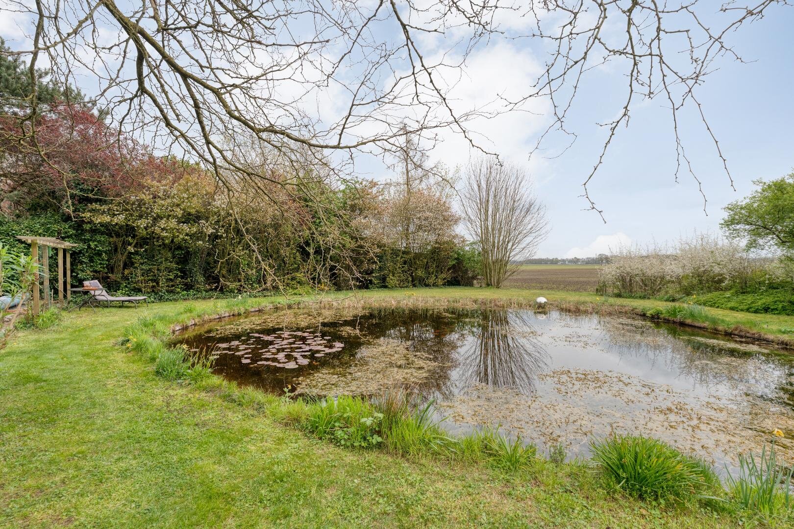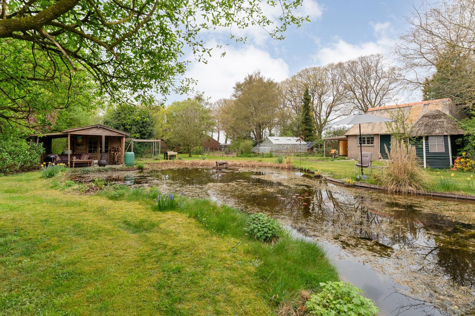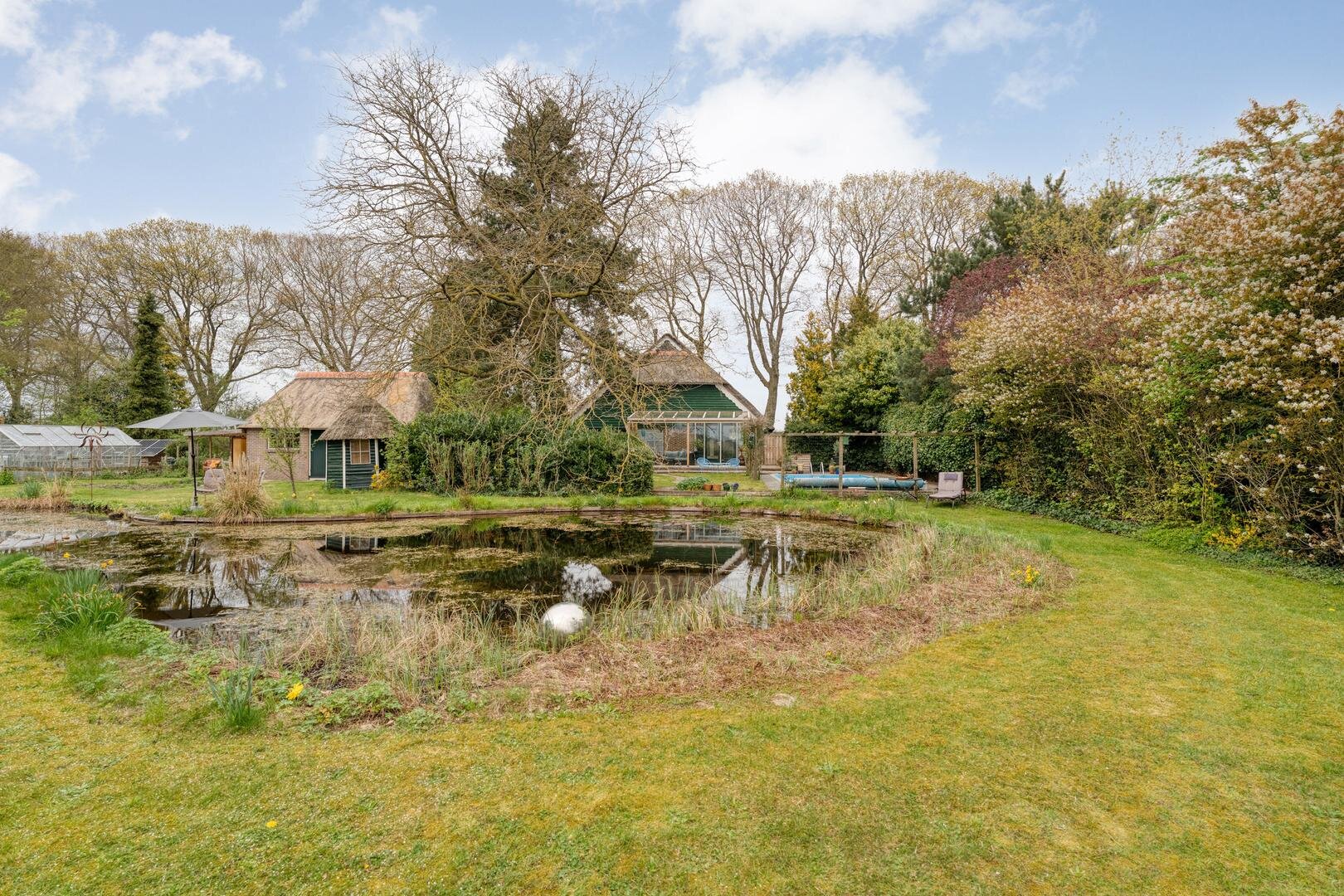 In de lente, zomer en herfst zijn de tuin met de fruitbomen, de moestuin, het zwembad en in het centrale hart de vijver ronduit geweldig. Ook van het feit dat je hier de hazen, fazanten, eekhoorns en reeën voorbij ziet komen én er jaarlijks eenden broeden in de eendenkooi, hebben wij volop genoten.