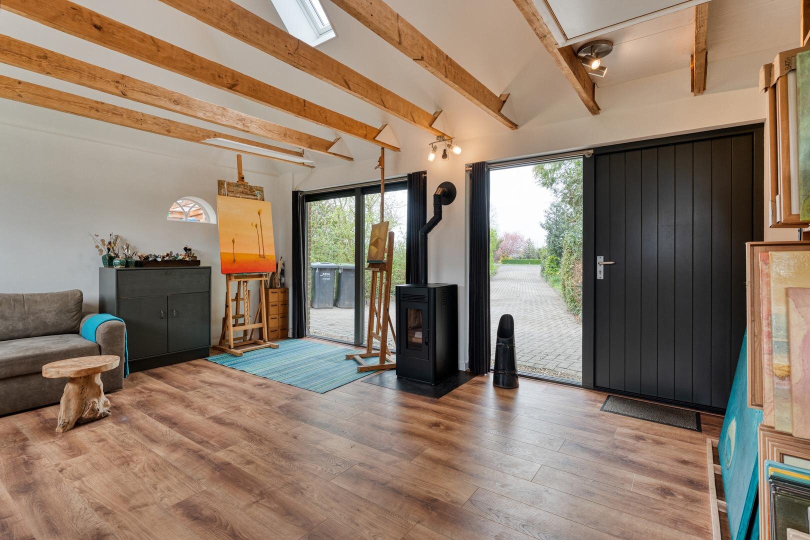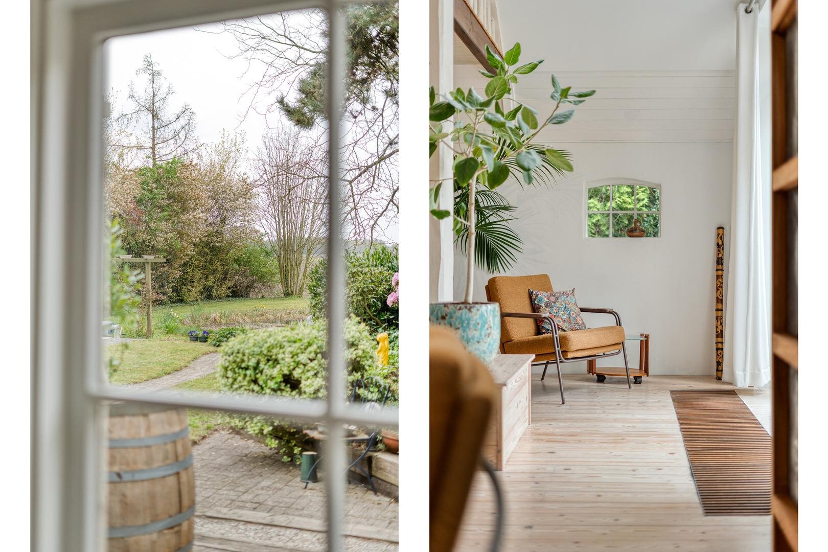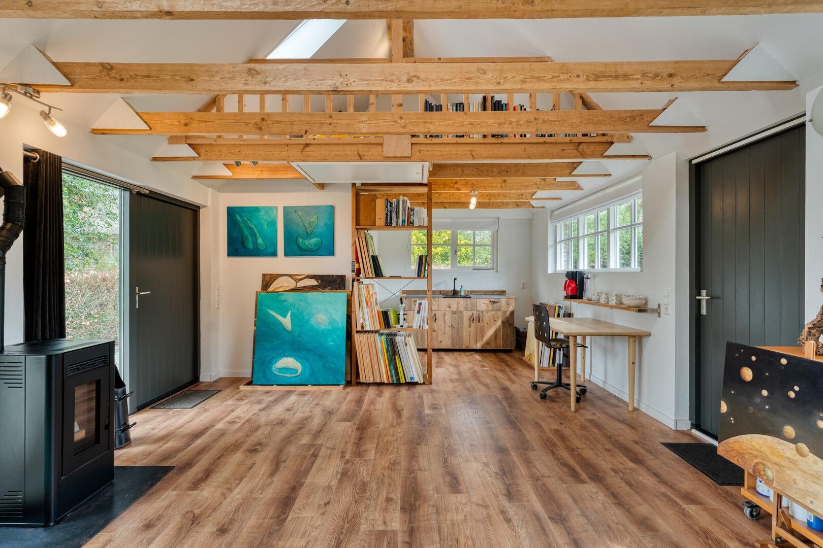 In de winter zit je heerlijk comfortabel bij de houtkachel in de ruime en sfeervolle woonkamer. Ook het gastenverblijf/atelier en de serre zijn fijne plekken om te verblijven.