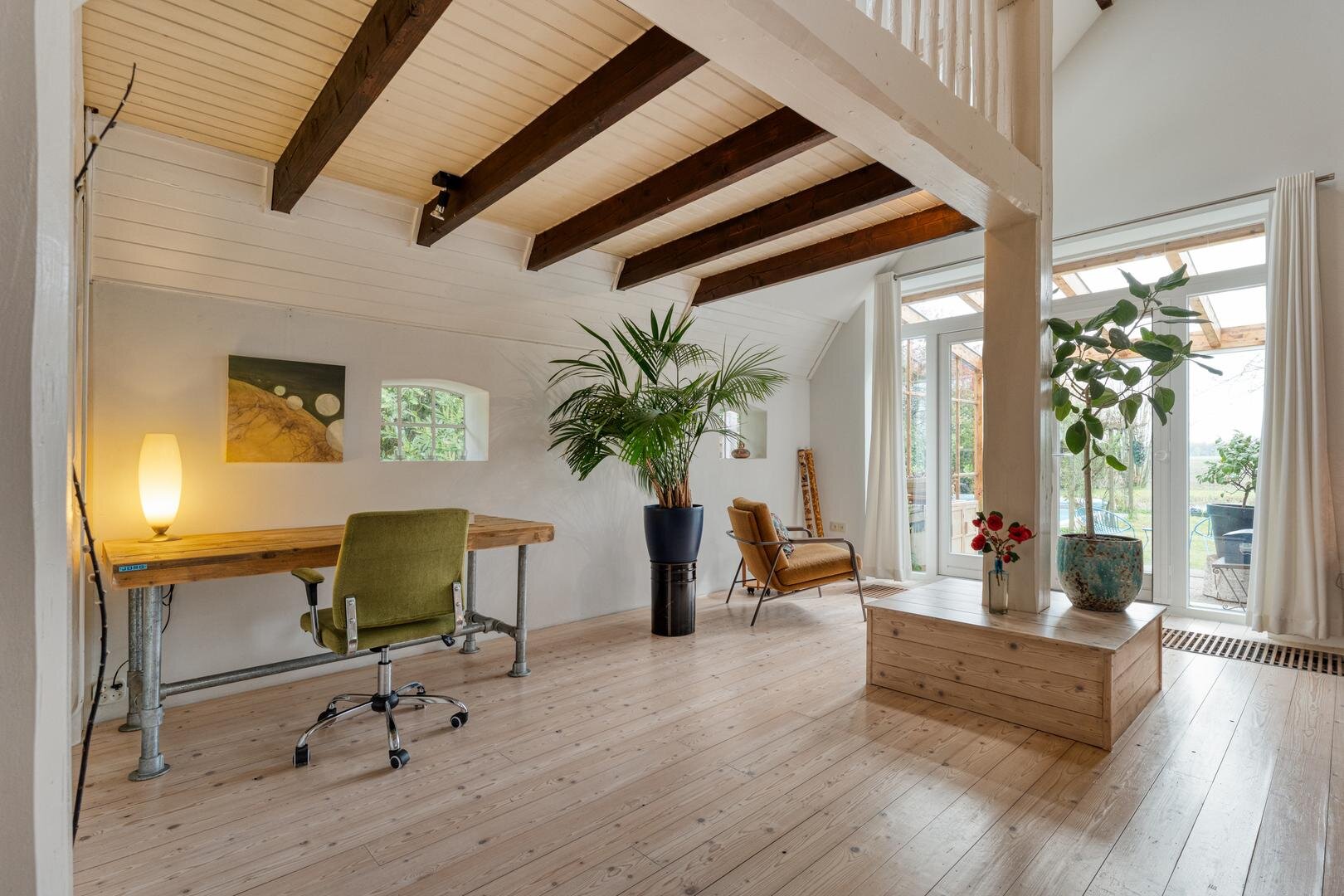 Daarnaast beschikt het erf over een volwaardig bijgebouw met een eigen woonkamer, keuken, badkamer en een slaapkamer op de vide, wat het geheel bijzonder veelzijdig maakt. Deze zelfstandige ruimte biedt tal van mogelijkheden: ideaal voor dubbele bewoning, bijvoorbeeld voor mantelzorg, inwonende familie of een opgroeiend kind dat behoefte heeft aan meer zelfstandigheid. Ook leent het bijgebouw zich uitstekend voor werken aan huis, zoals een kantoor, praktijkruimte of creatief atelier.