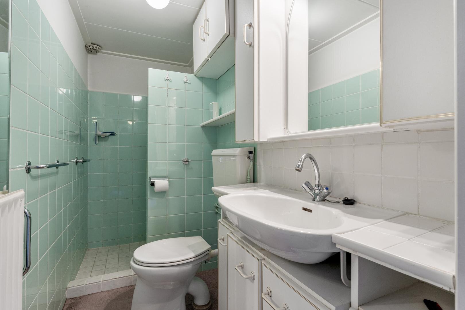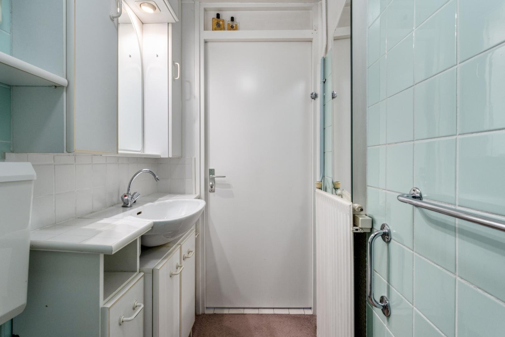 Badkamer met inloopdouche, toilet en wastafel met meubel. Via vaste trap naar...