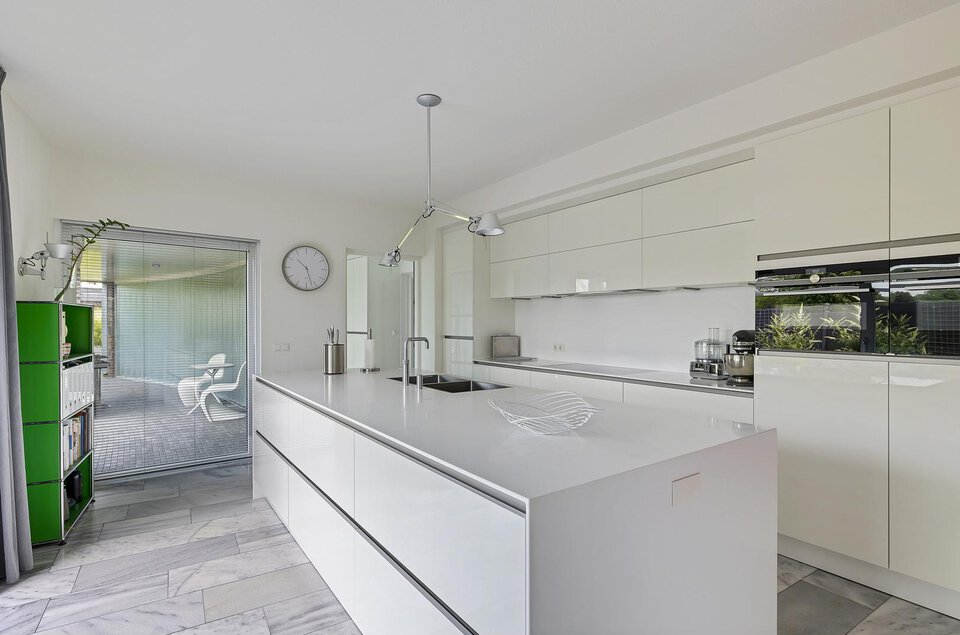Begane grond; Statige hal met trappartij en vide, toilet met urinoir. Sfeervolle Living met marmeren vloer, vloerverwarming en tuindeuren naar het terras met vlonder. Half open keuken met moderne inbouwkeuken en kookeiland v.v. luxe apparatuur. Ruim kantoor met mooie raampartij. 1 slaapkamer en een badkamer met wastafelmeubel en inloopdouche. Bijkeuken, berging en dubbele garage.