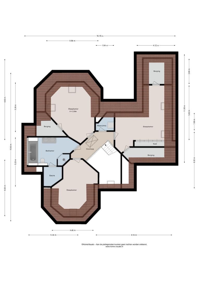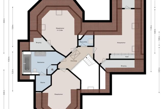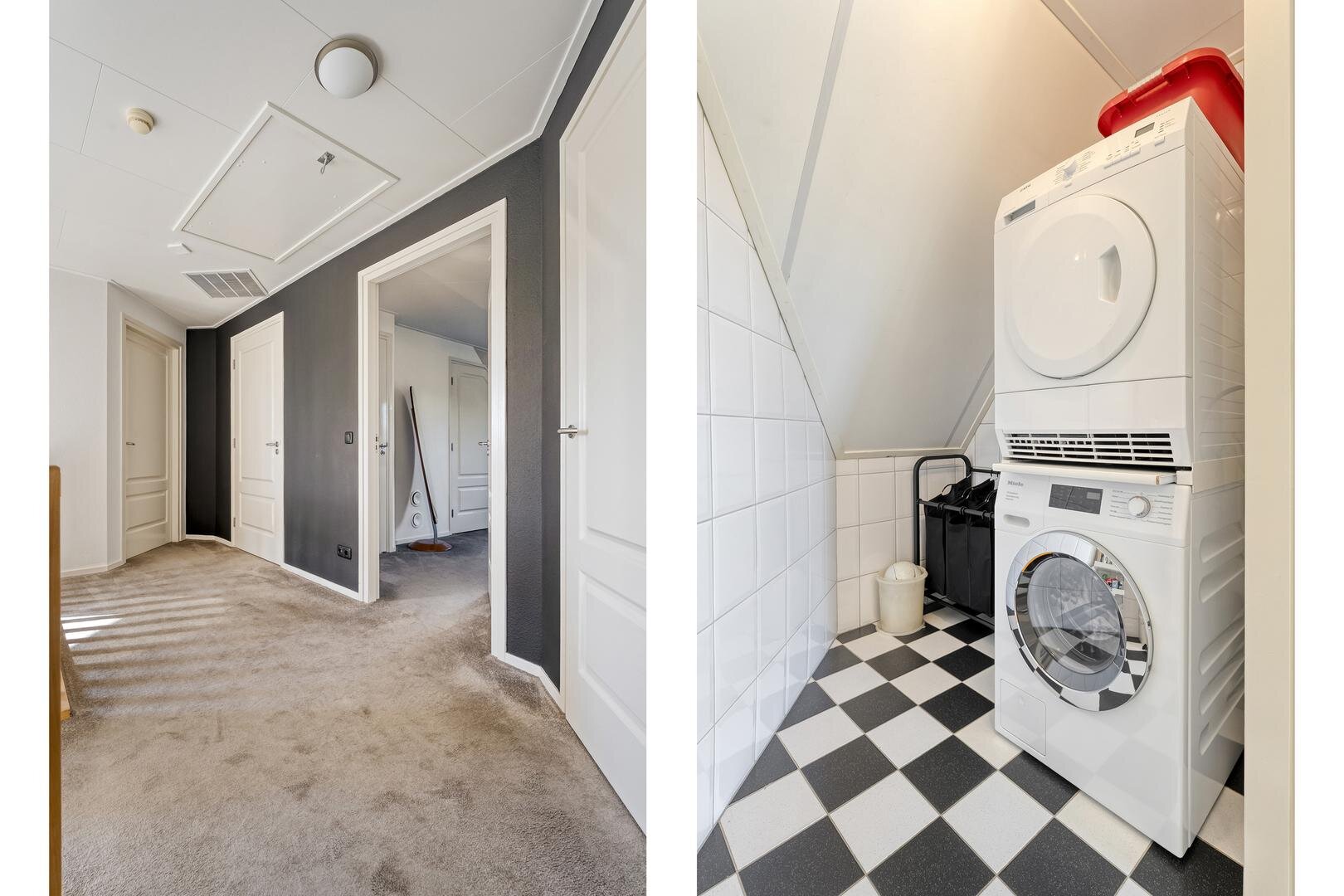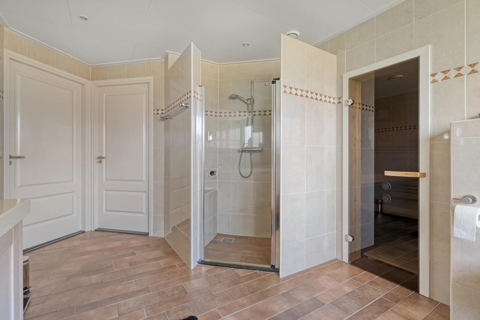 Eerste verdieping: Overloop. Drie ruime slaapkamers. Wasruimte. Meerdere bergruimtes. Badkamer voorzien van ligbad, inloopdouche, sauna, toilet en dubbel wastafelmeubel.