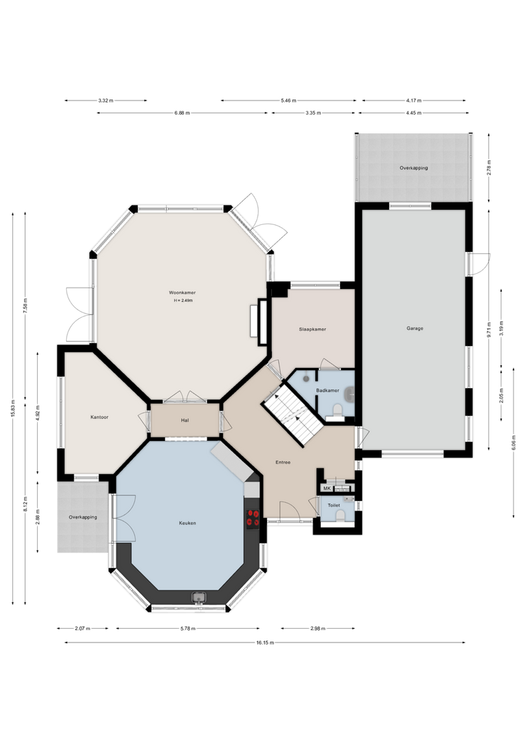 Begane grond: Entree met toilet en trap naar de eerste verdieping. Hal naar de keuken uit 2023 voorzien van inbouwapparatuur; elektrische kookplaat, afzuiging, koelkast, koffiezetapparaat, Quooker Cube, wijnkoelkast, vaatwasser en veel werkblad. Openslaande deuren naar overkapping in de tuin. Woonkamer met grote raampartijen en openslaande deuren richting de tuin en het water. Ruimte welke geschikt is als kantoor, hobbyruimte of slaapkamer. Slaapkamer met badkamer voorzien van inloopdouche, toilet en wastafel. Garage met overkapping.