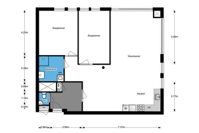 Het appartement beschikt over een ruime L vormige woonkamer met veel lichtinval, afgewerkt met een nette laminaatvloer en voorzien van een Frans balkon. De open keuken sluit hier mooi op aan en is uitgevoerd met inbouwapparatuur waaronder een koel vriescombinatie, vaatwasser, inductiekookplaat, heteluchtoven en afzuigkap. Het hoge plafond versterkt het ruimtelijke gevoel en zorgt voor een aangename woonbeleving.