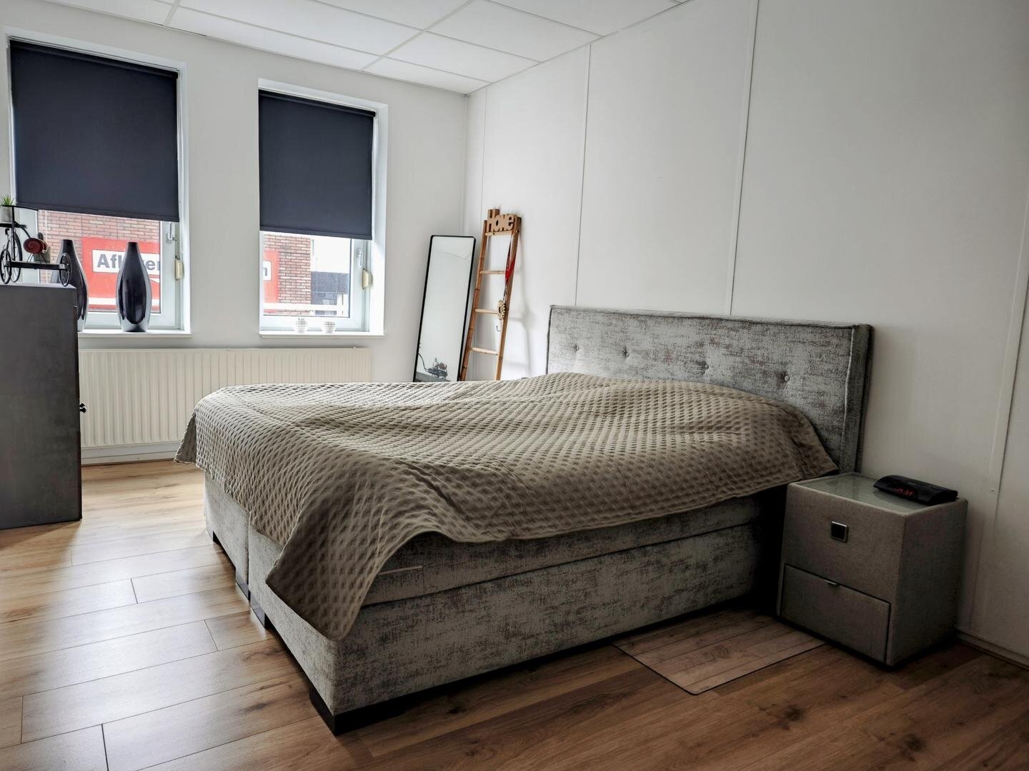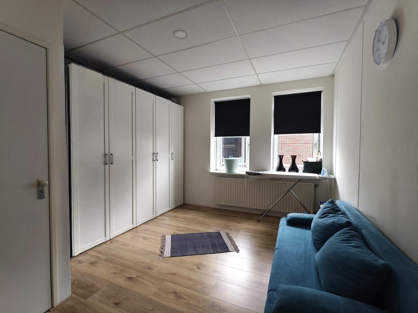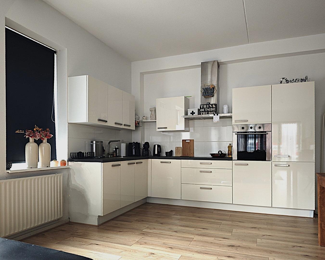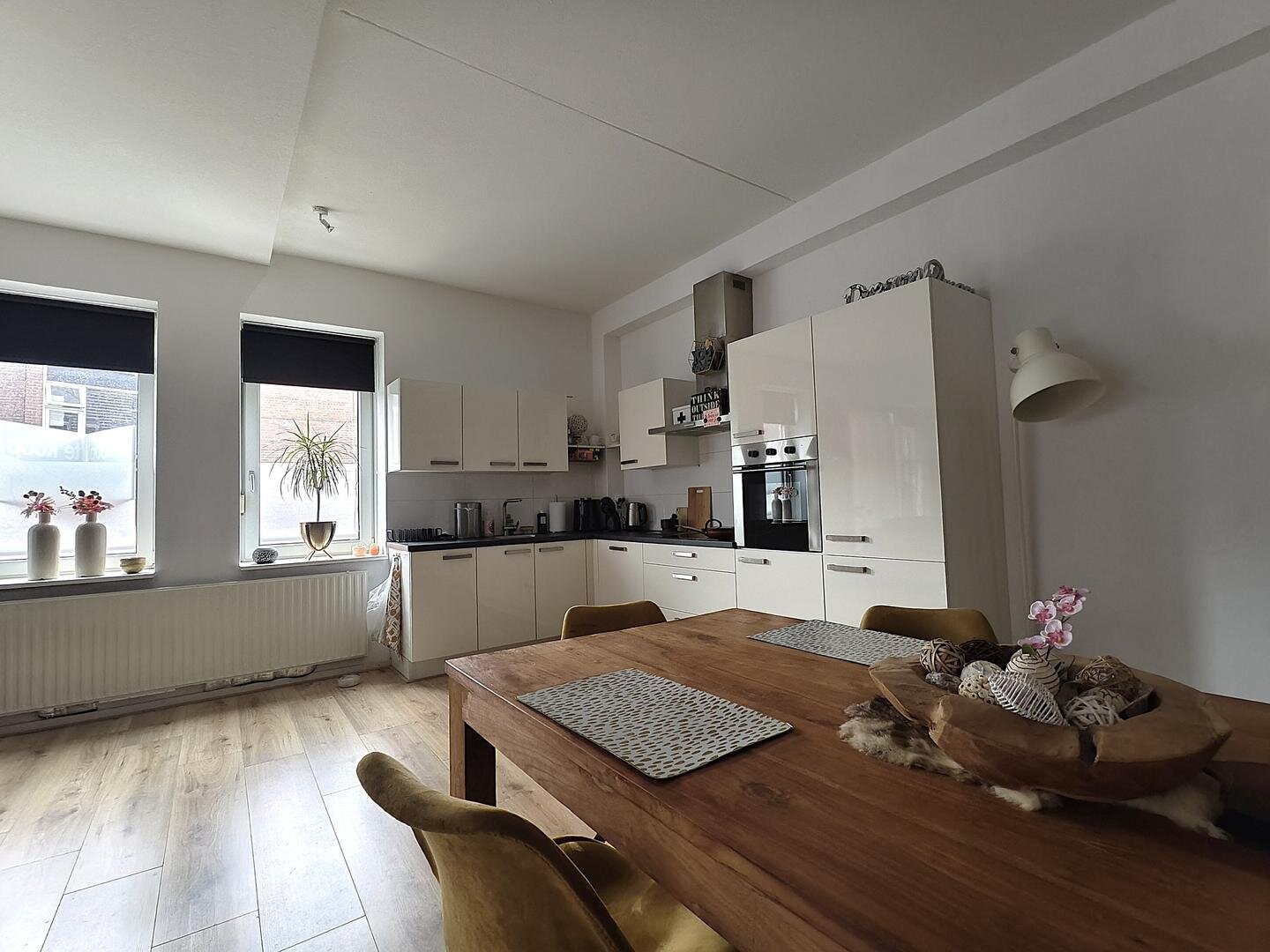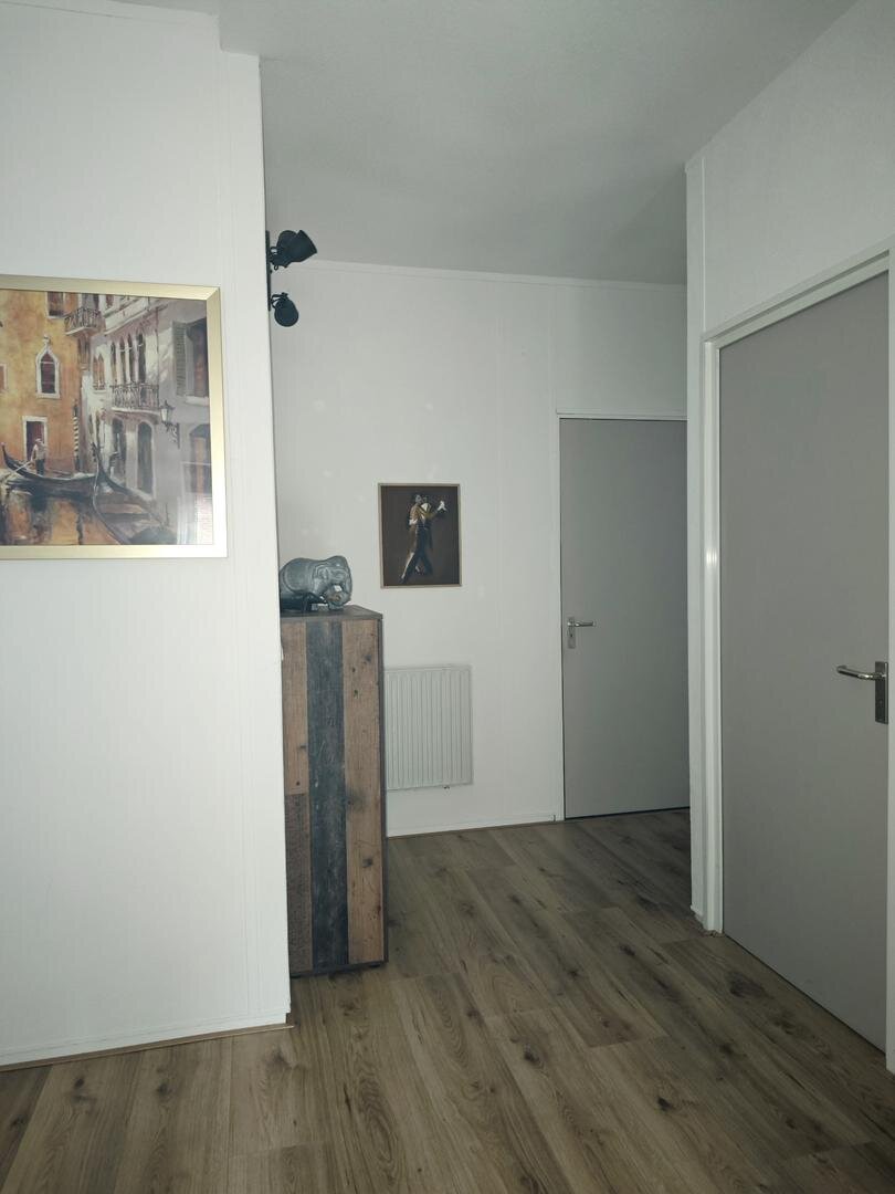 Het appartement beschikt over een ruime L vormige woonkamer met veel lichtinval, afgewerkt met een nette laminaatvloer en voorzien van een Frans balkon. De open keuken sluit hier mooi op aan en is uitgevoerd met inbouwapparatuur waaronder een koel vriescombinatie, vaatwasser, inductiekookplaat, heteluchtoven en afzuigkap. Het hoge plafond versterkt het ruimtelijke gevoel en zorgt voor een aangename woonbeleving.
