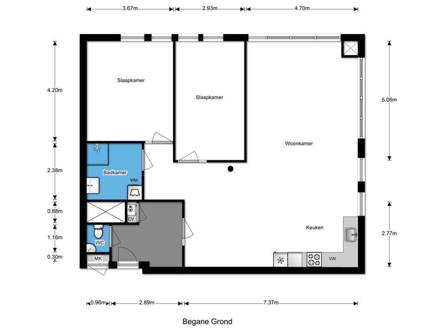 Bij binnenkomst bevindt zich de entree met video intercom en een separaat toilet. Vanuit de hal zijn tevens de overige vertrekken bereikbaar. Het appartement beschikt over twee slaapkamers, waarvan één met vaste kast. De moderne badkamer is vernieuwd in 2019 en voorzien van een douche met infraroodpaneel, wastafel en aansluiting voor een wasmachine. In het souterrain bevinden zich de gezamenlijke fietsenberging en de eigen inpandige berging van circa vijf vierkante meter.