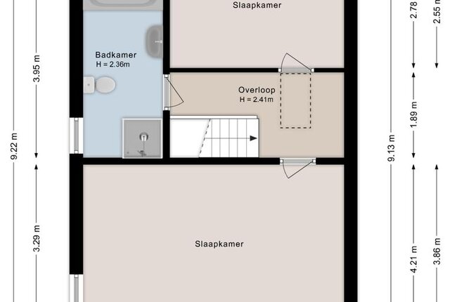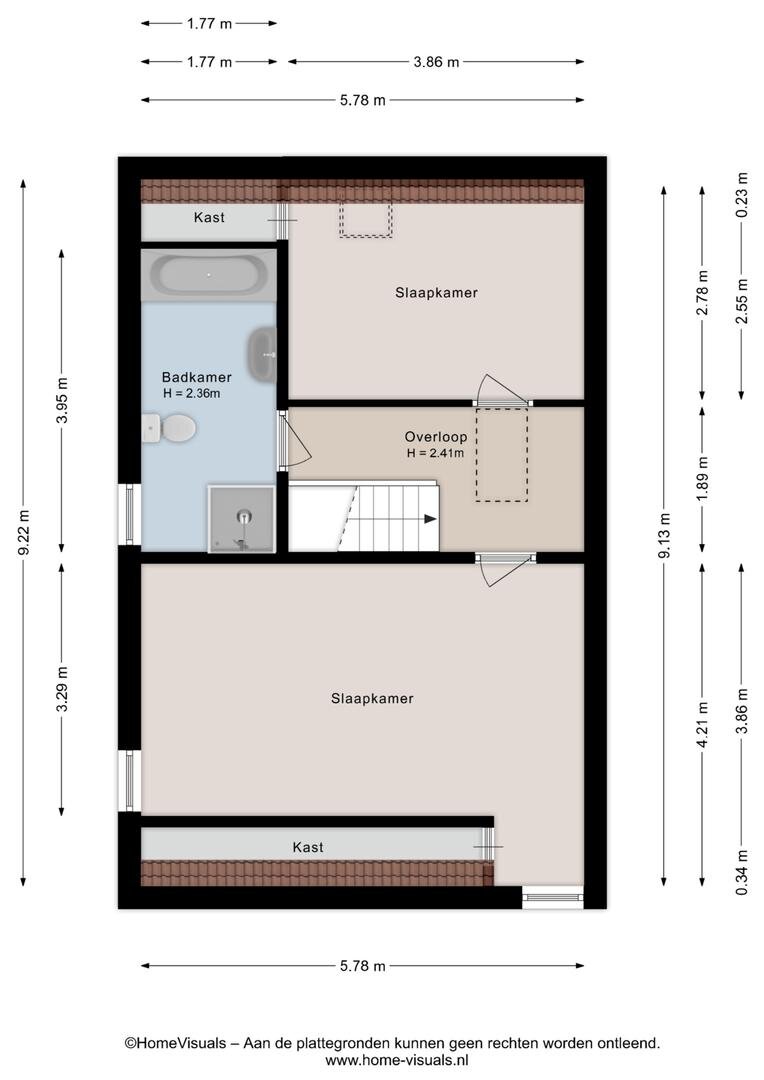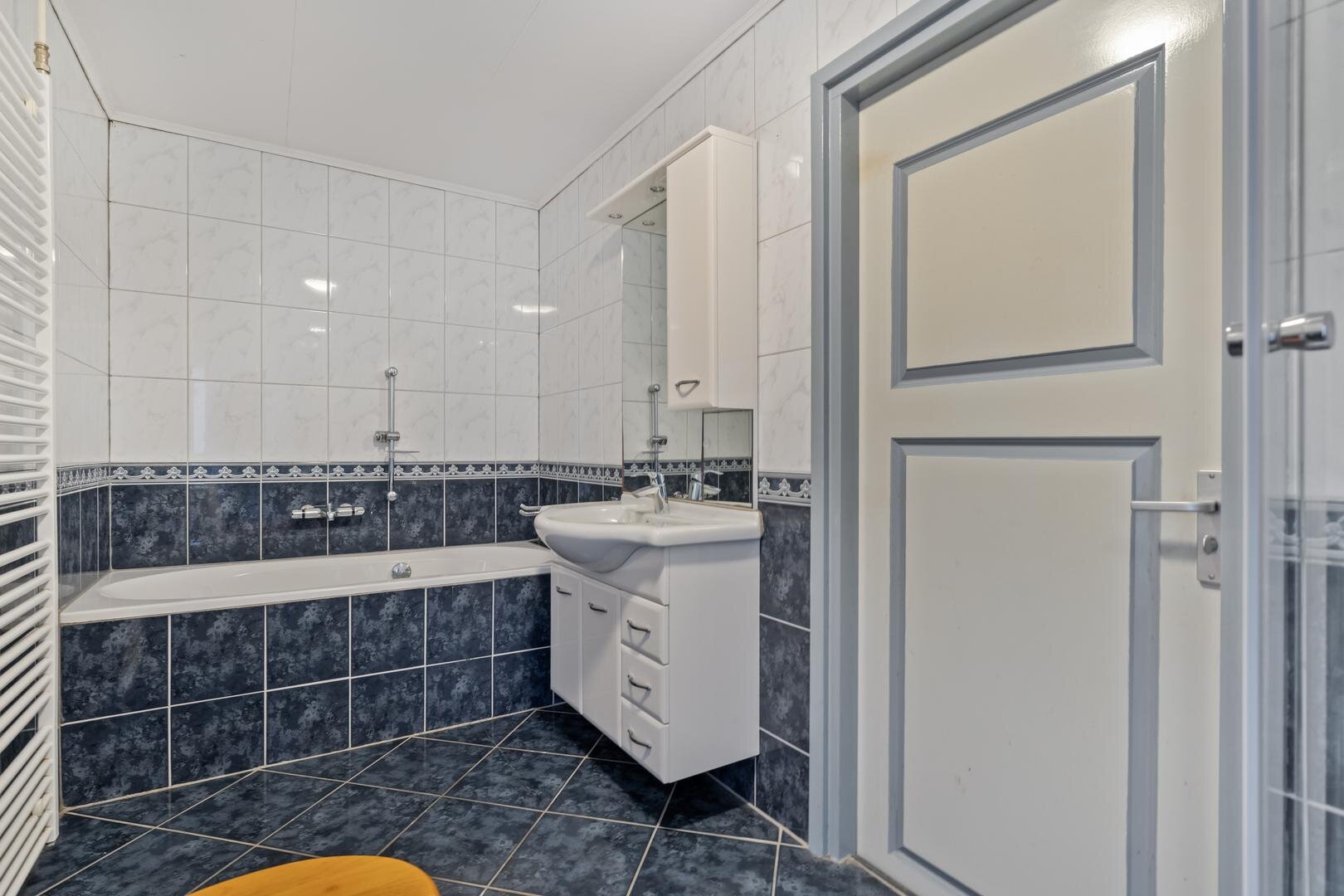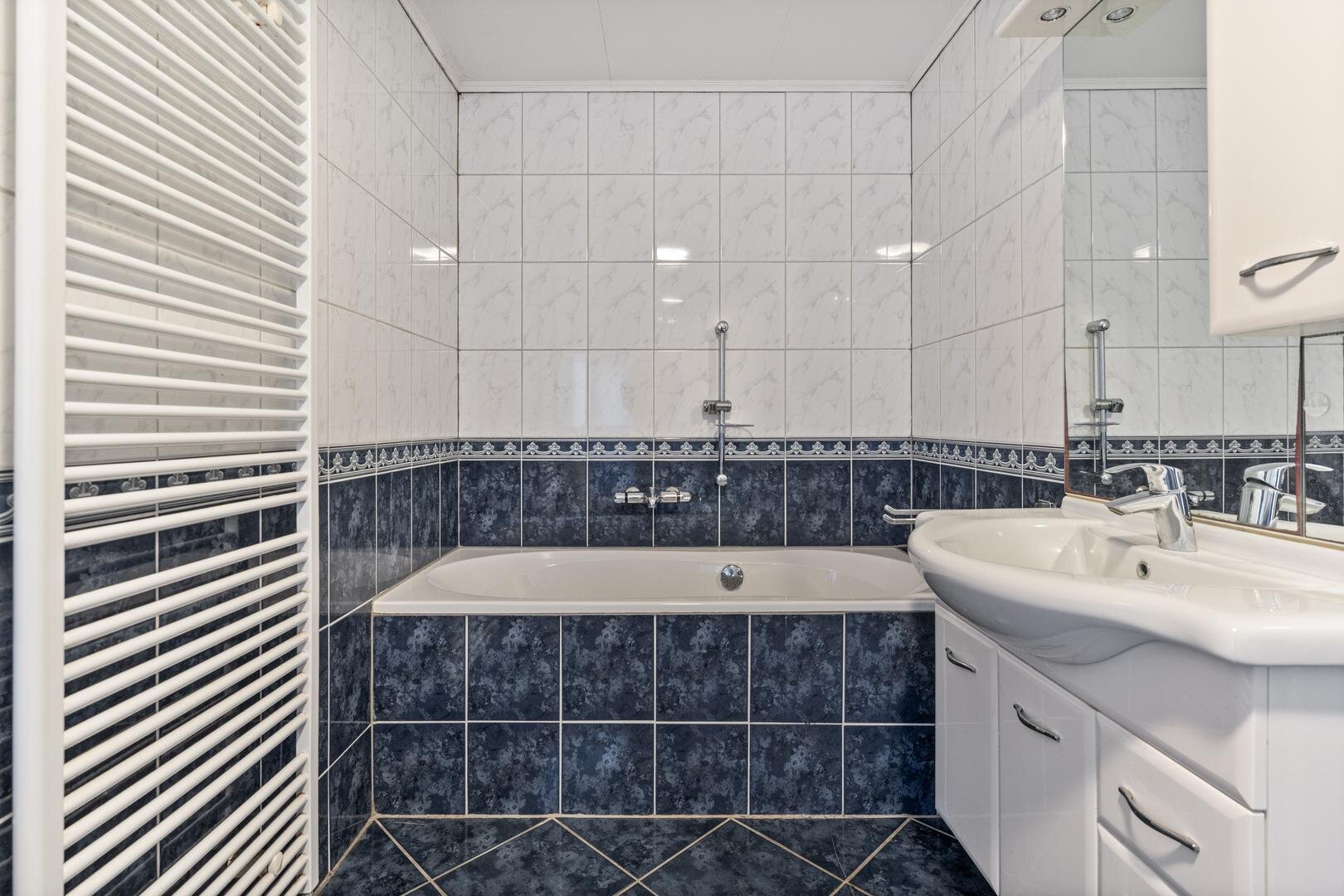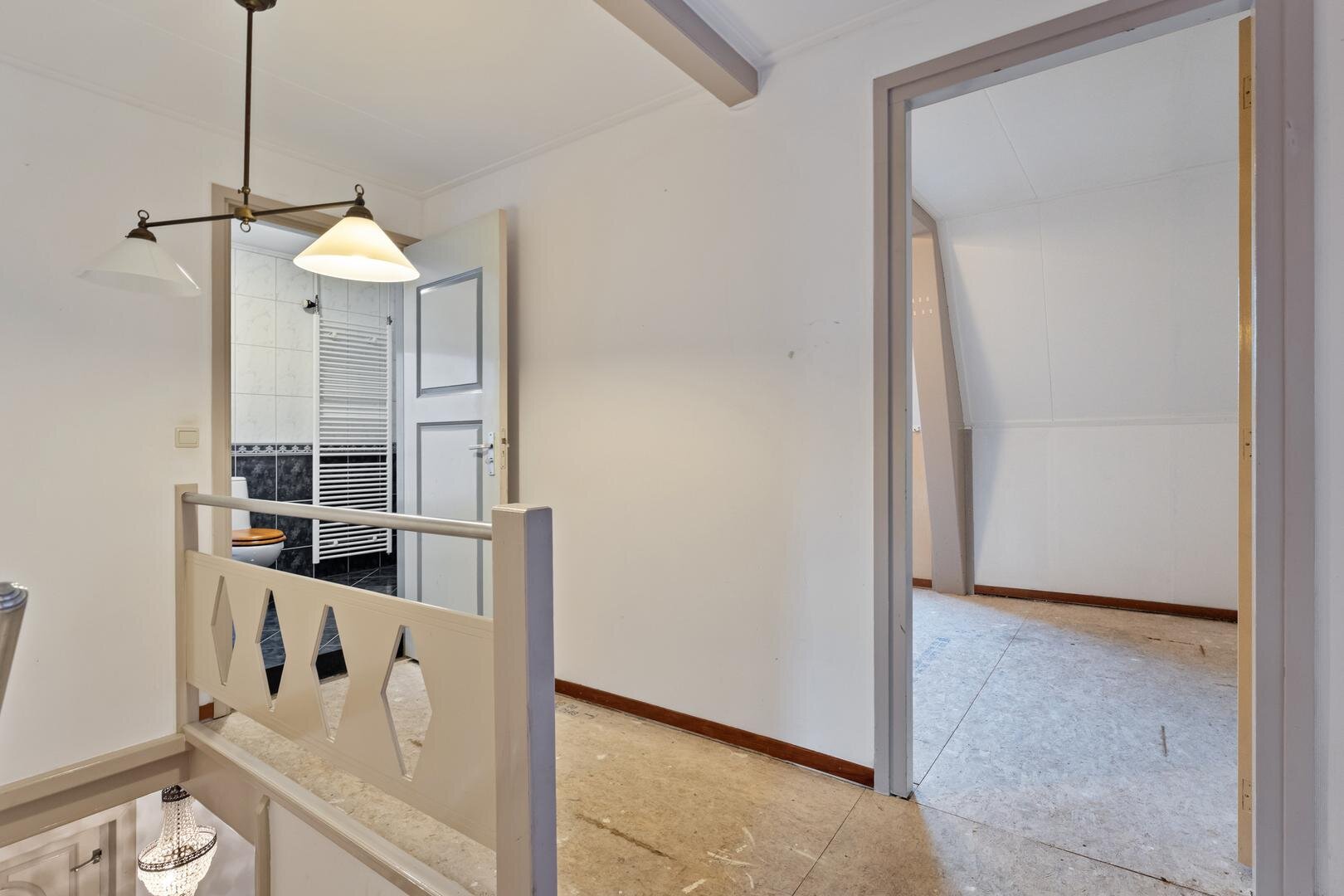 Eerste verdieping: Overloop. 2 Slaapkamers waarvan 1 met inloopkast en 1 met een vaste kast. Badkamer met ligbad, douche, wastafel met meubel en toilet. Via vlizotrap naar...