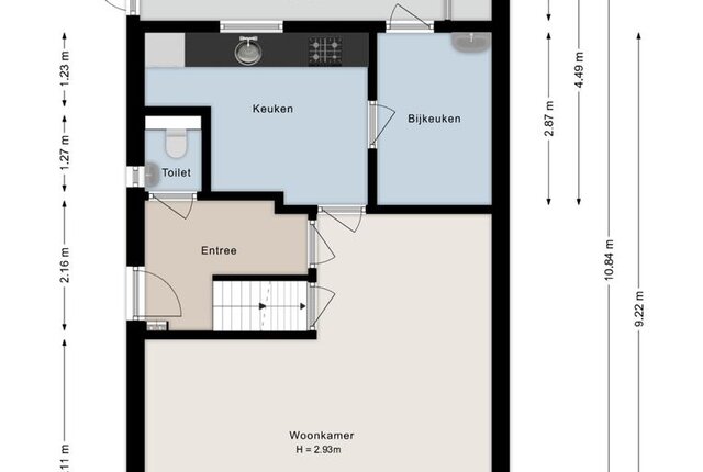Begane grond: hal, meterkast en toilet. Woonkamer. Dichte keuken met 5 pits gastoestel, afzuigkap en koelkast.