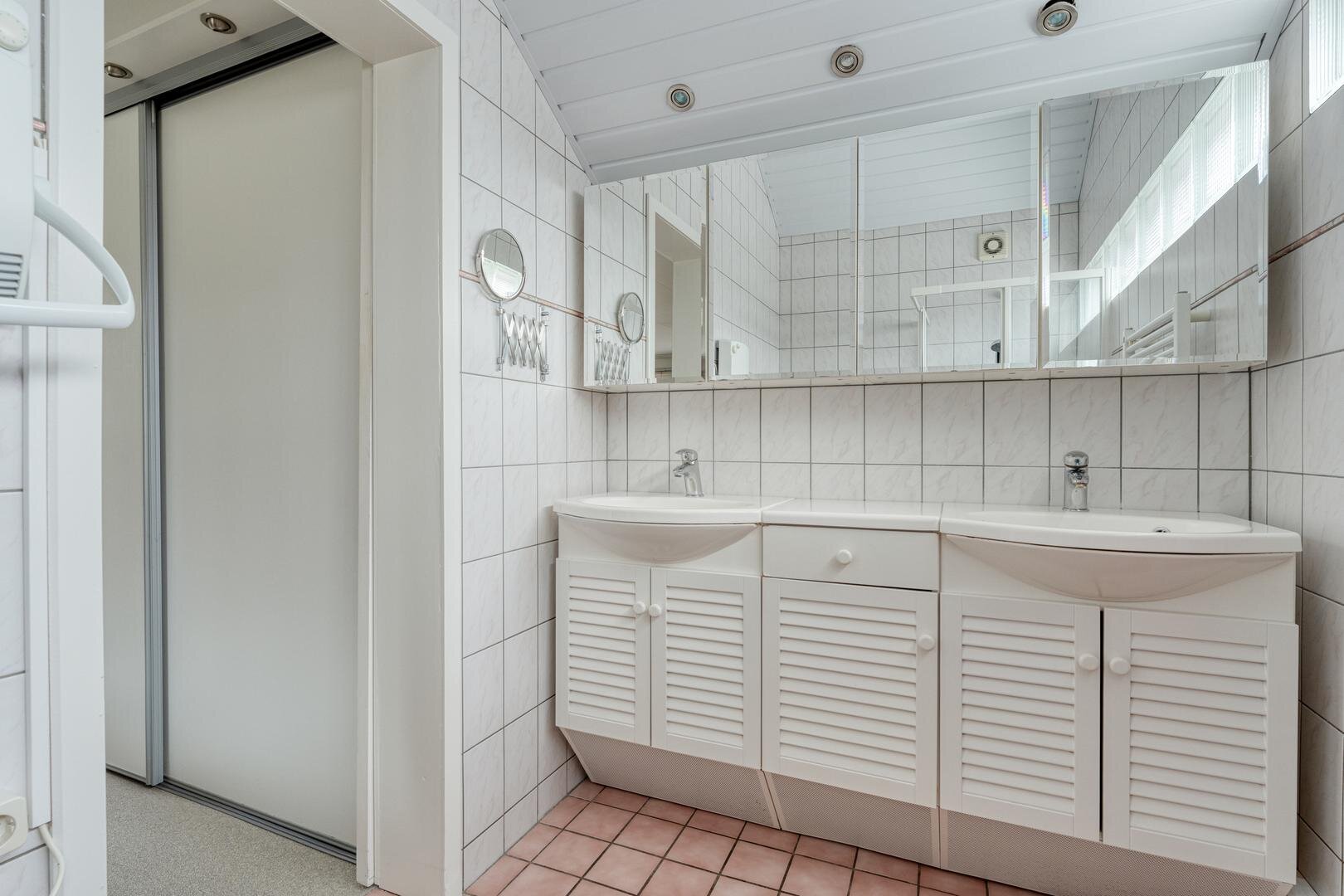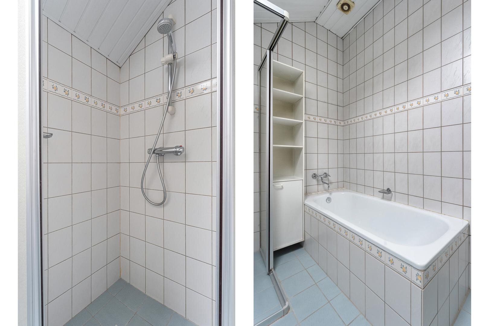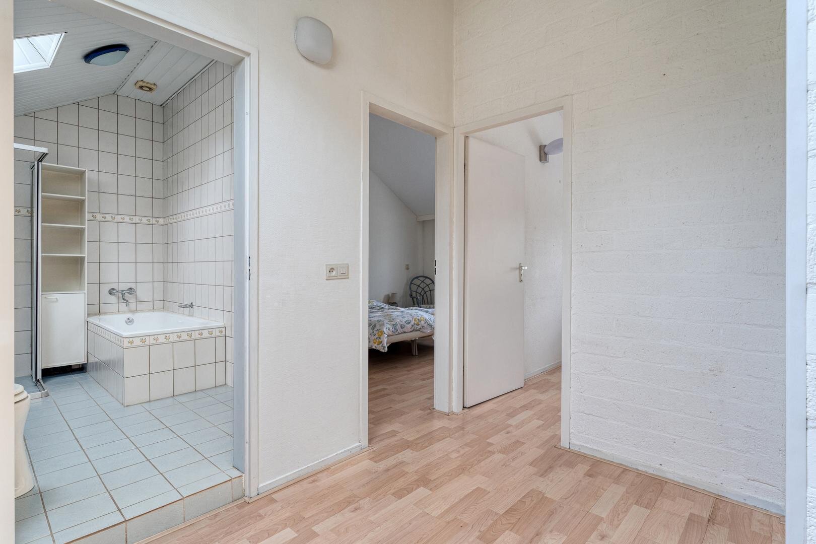 Eerste verdieping: Overloop. Twee slaapkamers voorzien van een laminaatvloer. Badkamer met ligbad, douche, toilet en wastafel. Berging.
