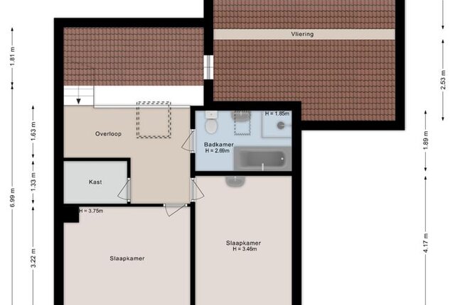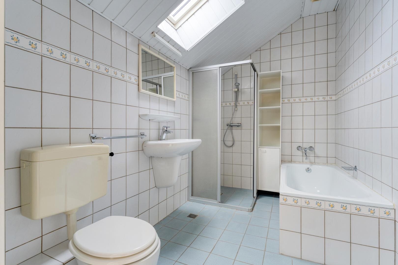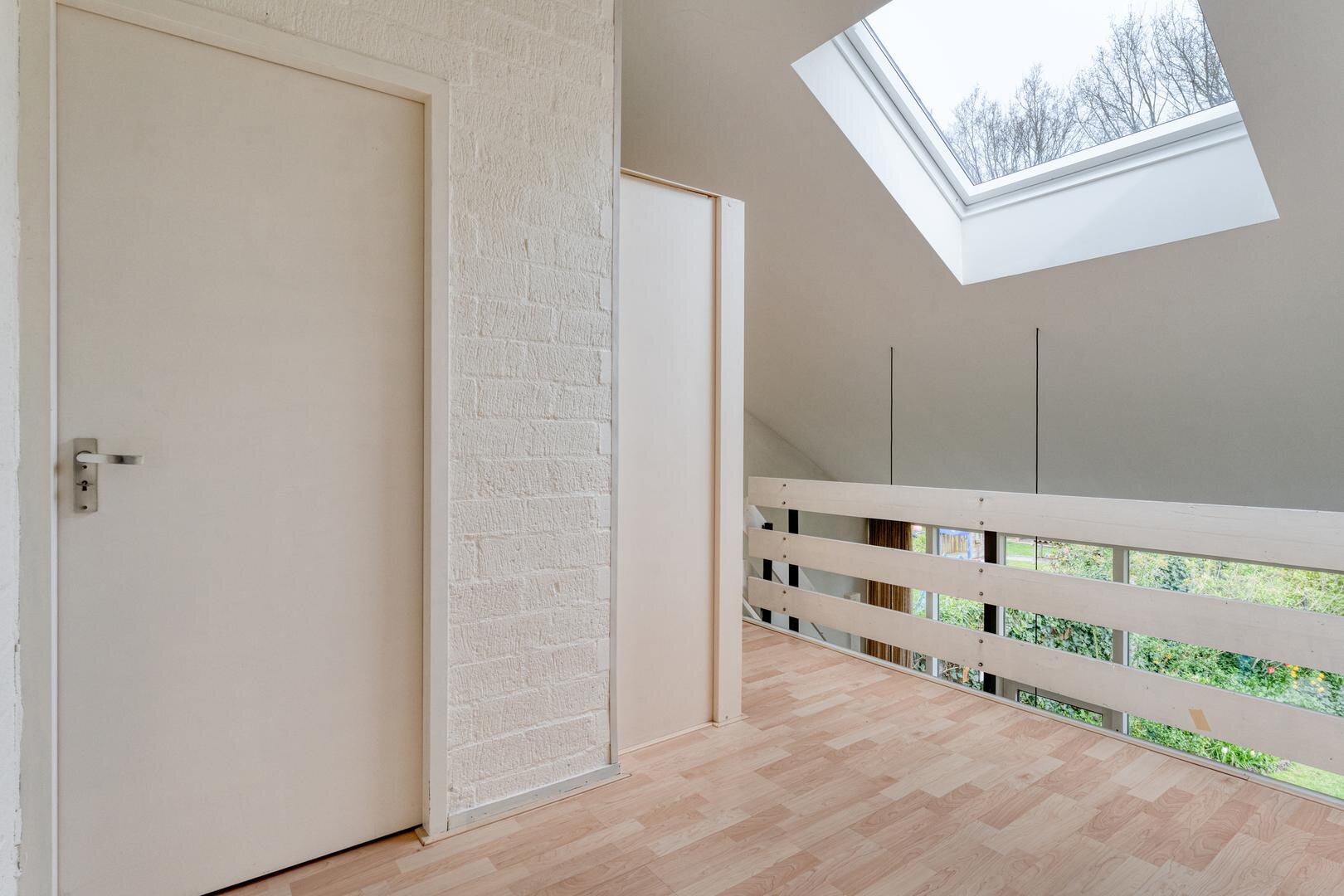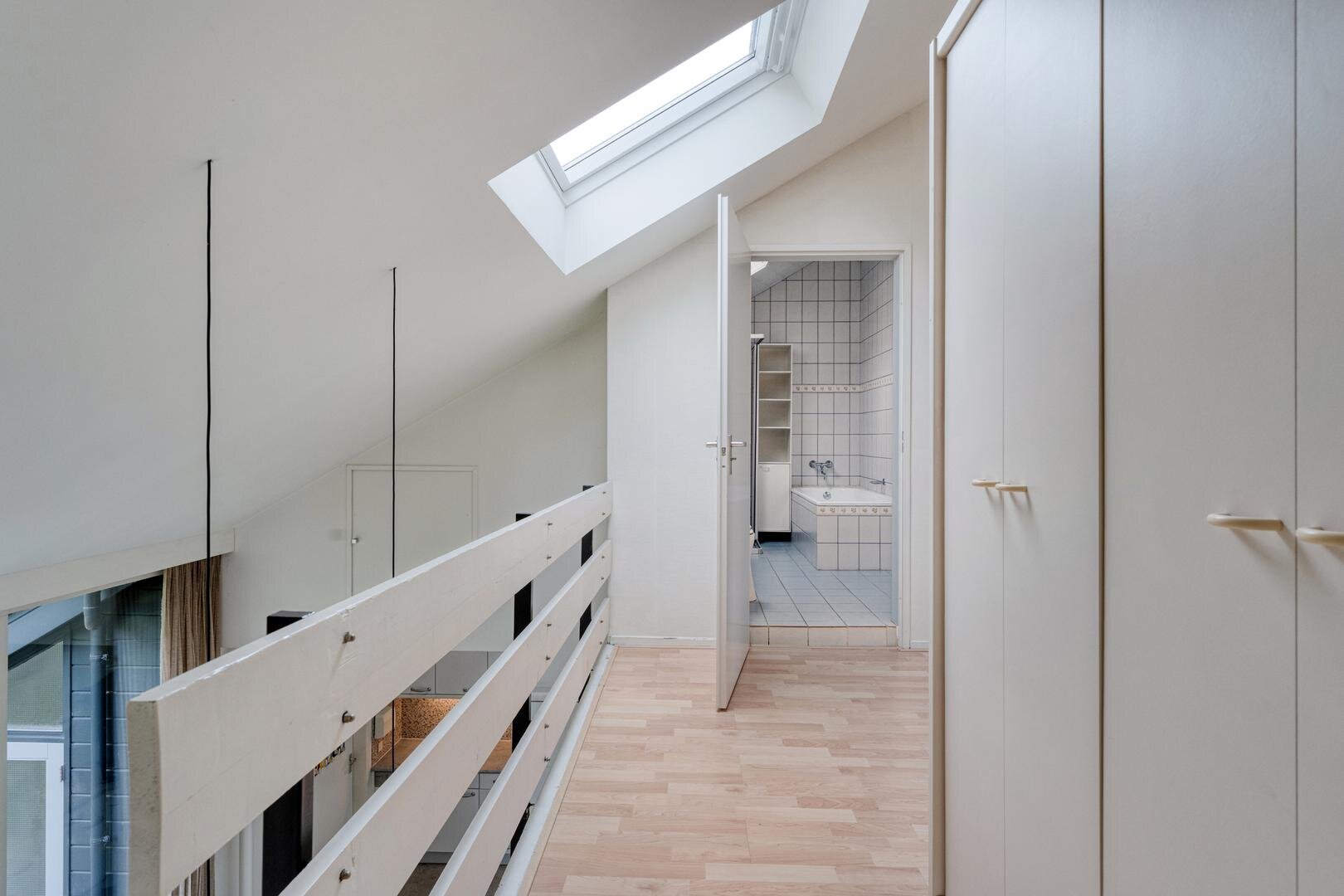 Eerste verdieping: Overloop. Twee slaapkamers voorzien van een laminaatvloer. Badkamer met ligbad, douche, toilet en wastafel. Berging.